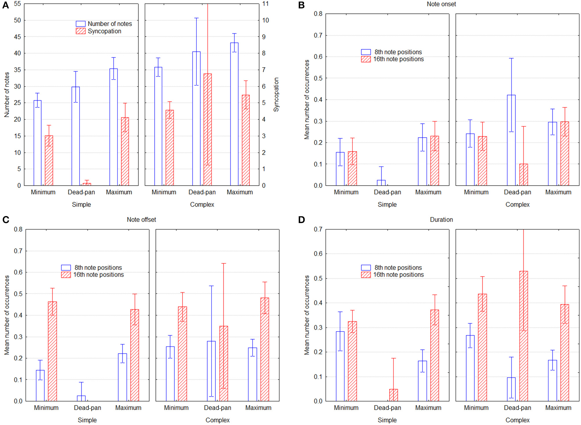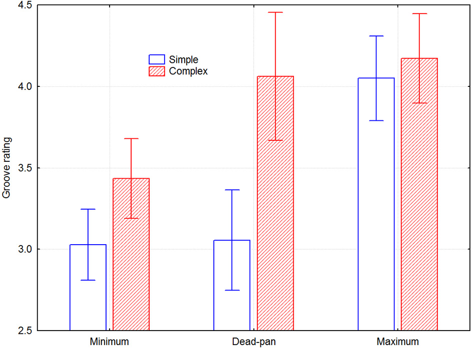 The MRA results suggest a pattern in which groove is associated with higher density, more 8th- and 16th note onsets and offsets, and with fewer 8th- and 16th note durations. MT yields no significant weights at all, but five out of six weights are slightly negative. These patterns are largely the same for simple and complex melodies, but there are two differences. First, 8th note offsets play a greater role for simple melodies than for complex ones. Second, the importance of 8th and 16th onsets seems to be reversed, so that the former is more important for simple and the latter more important for complex melodies. This makes sense because the complex melodies have in fact more fast note values, and that would require adding even smaller note values to increase the metrical levels. These results do not inform about whether musicians increase or decrease these parameters relative to the deadpan versions, however, so the relevant parameters are plotted for all three conditions in Figure 2, Significant differences in Figure 2 can be gleaned from the confidence intervals depicted by the error bars. Panel A shows that both the number of notes and the syncopation measure are greater in the maximum groove condition. That syncopation is greatest for the deadpan version is because melody 12 has an extremely high rating (see Table 1), owing to a very complex time structure, and suggests that performers chose not to reproduce this subtle triplet pattern in the maximum and minimum groove conditions. Fewer notes in the minimum condition shows that adjacent same-pitch notes were aggregated given the performance rules above, whereas notes were added in the maximum condition. Apparently performers found additional notes, or the richer rhythmical structure facilitated with them, to be associated with groove. This is also reflected in the syncopation values. The higher values for 8th notes in the deadpan versions of the complex melodies, as seen in Panel B, derives mainly from melodies 7 and 9, which are both characterized by a strong back-beat, which the performers apparently decided not to reproduce in its entirety. Otherwise the values for both 8th and 16th onset positions also follow the trend to be higher for maximum than for minimum groove, but here, for the 16th notes, the deadpan versions are much lower. The offset positions in Panel C exhibit no difference across groove intention, except for 8th notes in the simple melodies. The duration values in Panel D, finally, exhibit no difference for 16th notes, but substantially less 8th note durations for the maximum groove condition. Considering the pattern of MRA weights in Table 2, which is positive for onset and offset and negative for duration, this could be an artifact, in that the same onset and offset position leads to an even duration even if the onset is on an uneven position. For example, an onset one 16th before the beat and an offset a 16th before the next beat will yield an even 4th note duration, and therefore cancel each other out.