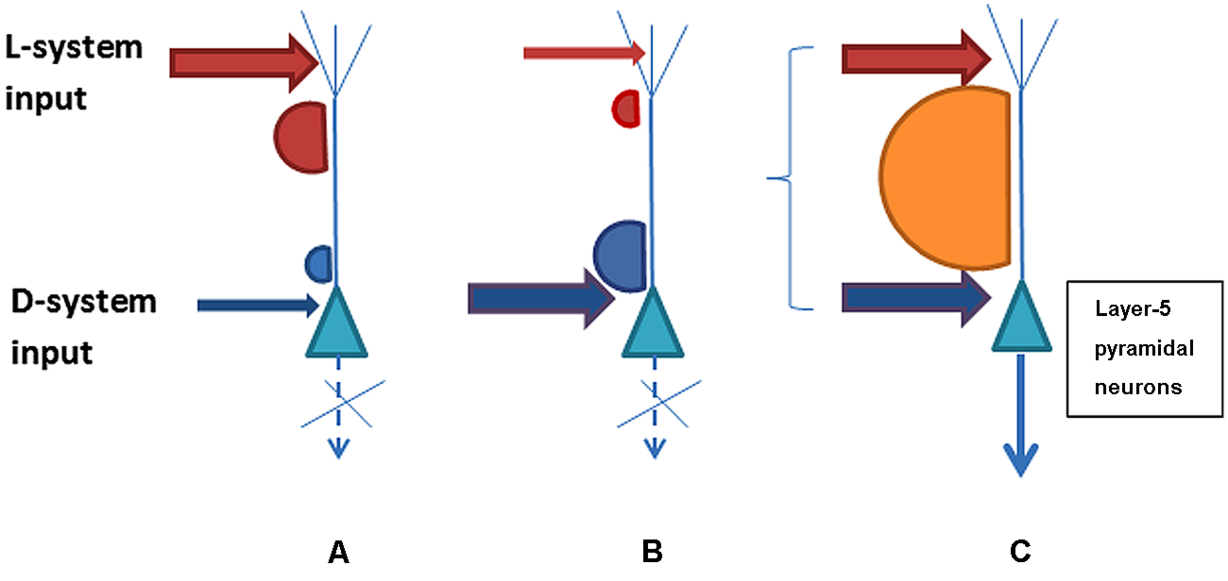 FIGURE 1. Three possible variants of L- and D-system presynaptic input to layer-5 pyramidal neurons that may determine contentful conscious experience. Variant (A) shows lack of sufficient acitivity for long-range integration and consciousness because D-system specific input to the perisomatic compartment of pyramidal neurons is weak or asynchronous with L-system presynaptic inputs to the neuron’s apical compartment. Variant (B) illustrates the opposite situation where the D-system presynaptic input is present but the L-system contribution is weak or incoincident. Both (A) and (B) represent scenarios lacking consciousness with its contents. In contrast, variant (C) illustrates sufficiently strong and synchronous presynaptic input from the D- and L-systems that leads to plateau-wave of activity and integration of the neuron’s contentful contribution to the phenomenal field of consciousness.