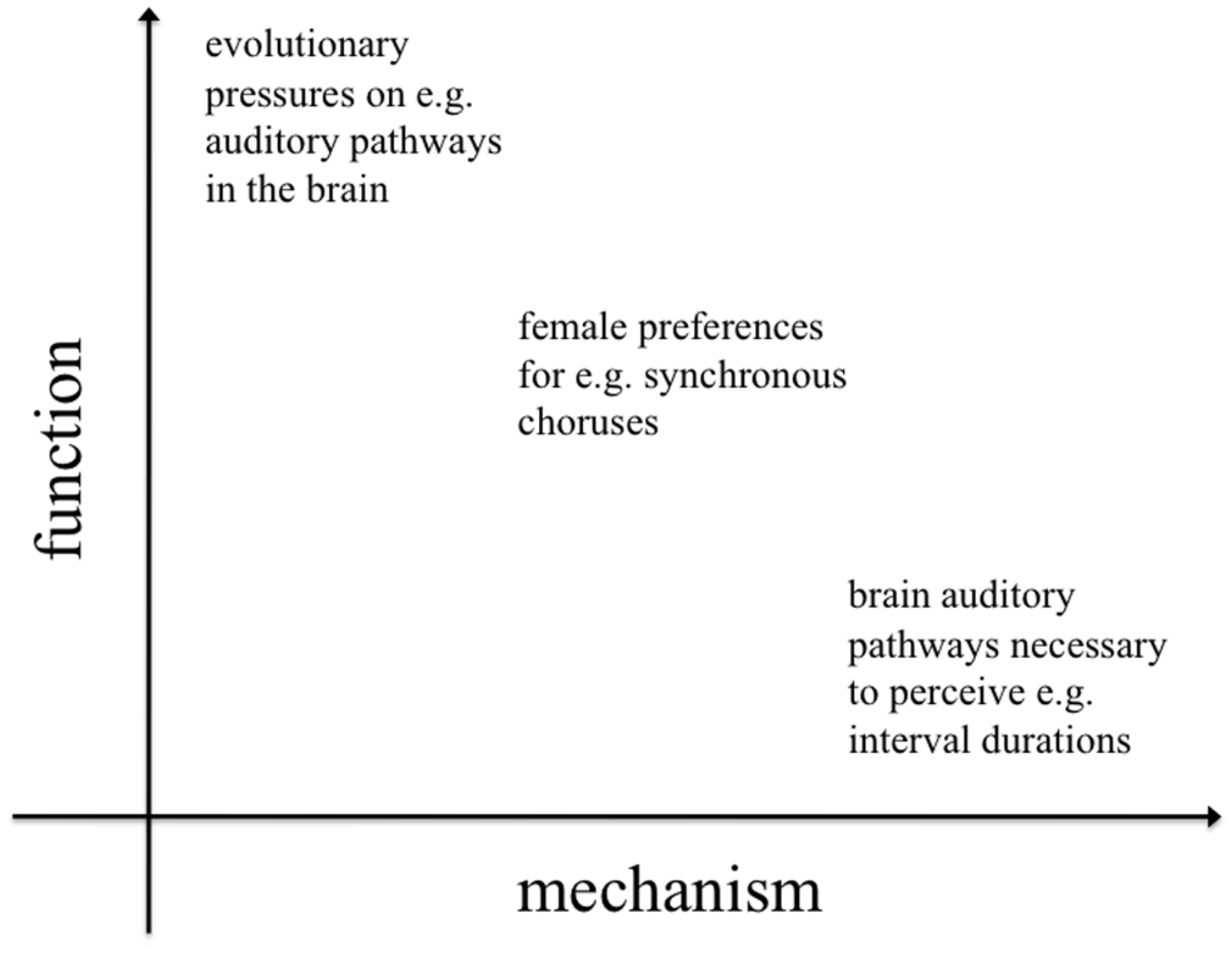 In conclusion, although mechanistic and functional questions are always linked in biological systems, they typically require different levels of explanation, and different types of data. Biomusicology can gain a deeper understanding of the evolution of rhythm by going beyond the vertebrate species more typically considered (mostly bird and mammal species), and exploring a broader range of taxa (orthopterans, fireflies, frogs, etc.). The array of living organisms exhibiting chorusing behavior, and the variety of evolutionary pressures acting on chorusing can provide crucial insights into the adaptive function(s) of rhythmic behavior in our “proto-musical” primate ancestors, and in turn inform our understanding of the biology and evolution of rhythm in human music and language.