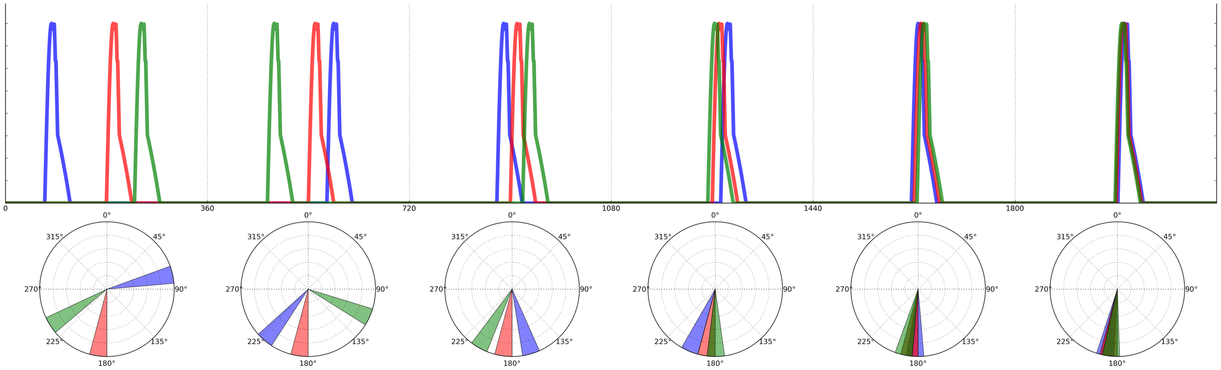 FIGURE 4. Agent based simulation of 3 individuals calling over six time periods (based on the model in Ravignani, 2014). Phases’ onsets of calls are depicted on top as time series. Time periods are separated by vertical lines, with the equivalent polar representation below each period. During the first time period, individuals listen to each other, so to shift their calls’ onset in the second period, repeating this strategy over time. The blue and green individuals will alternate as leader and follower over time periods; the red individual’s best strategy is, in this example, to keep its call onset constant over time periods. The agents will have reached almost perfect synchrony by period 6.