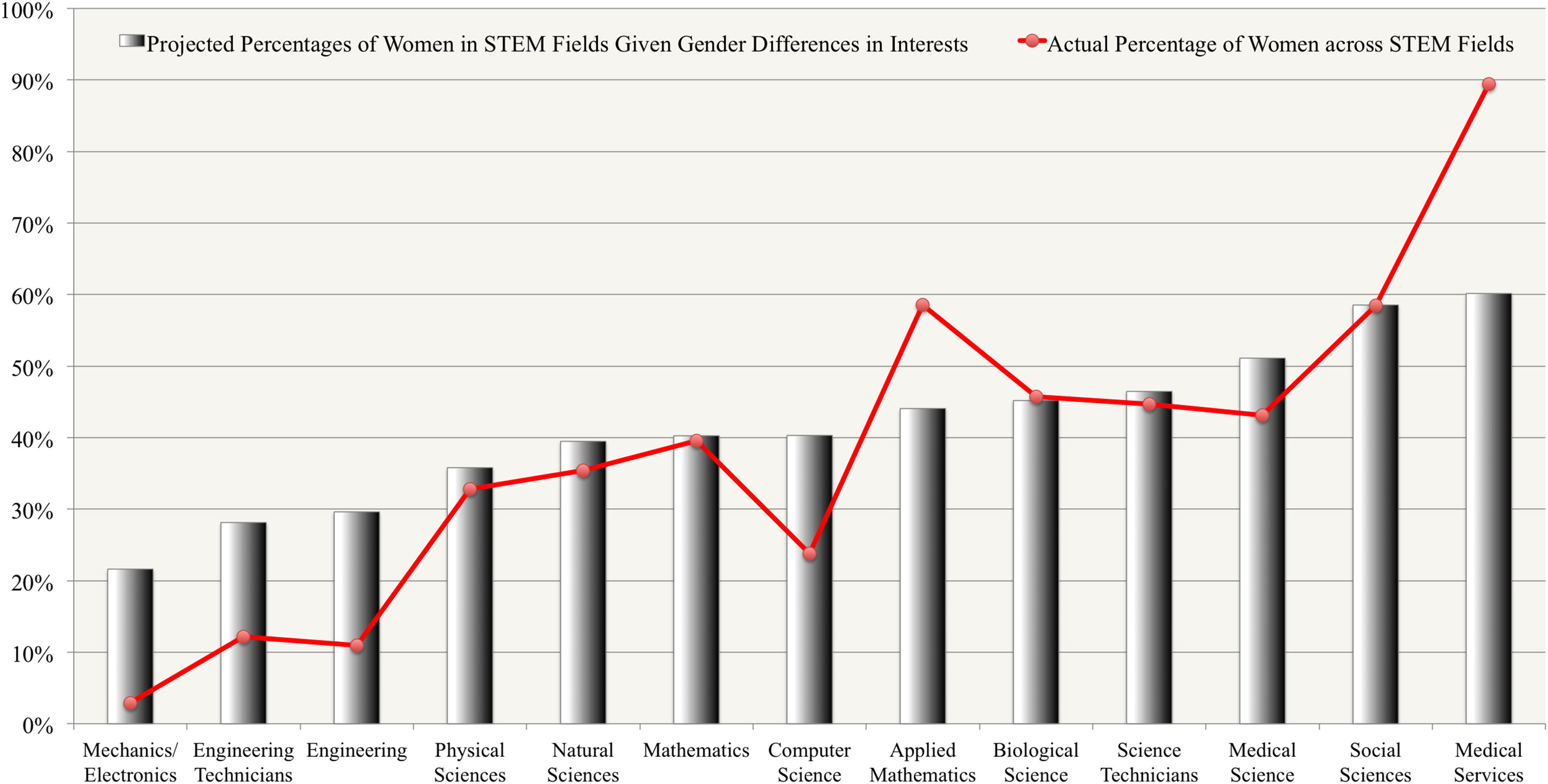 Figure 1. Comparison between projected percentages of women in STEM fields given gender differences in interests and actual gender composition across STEM fields.