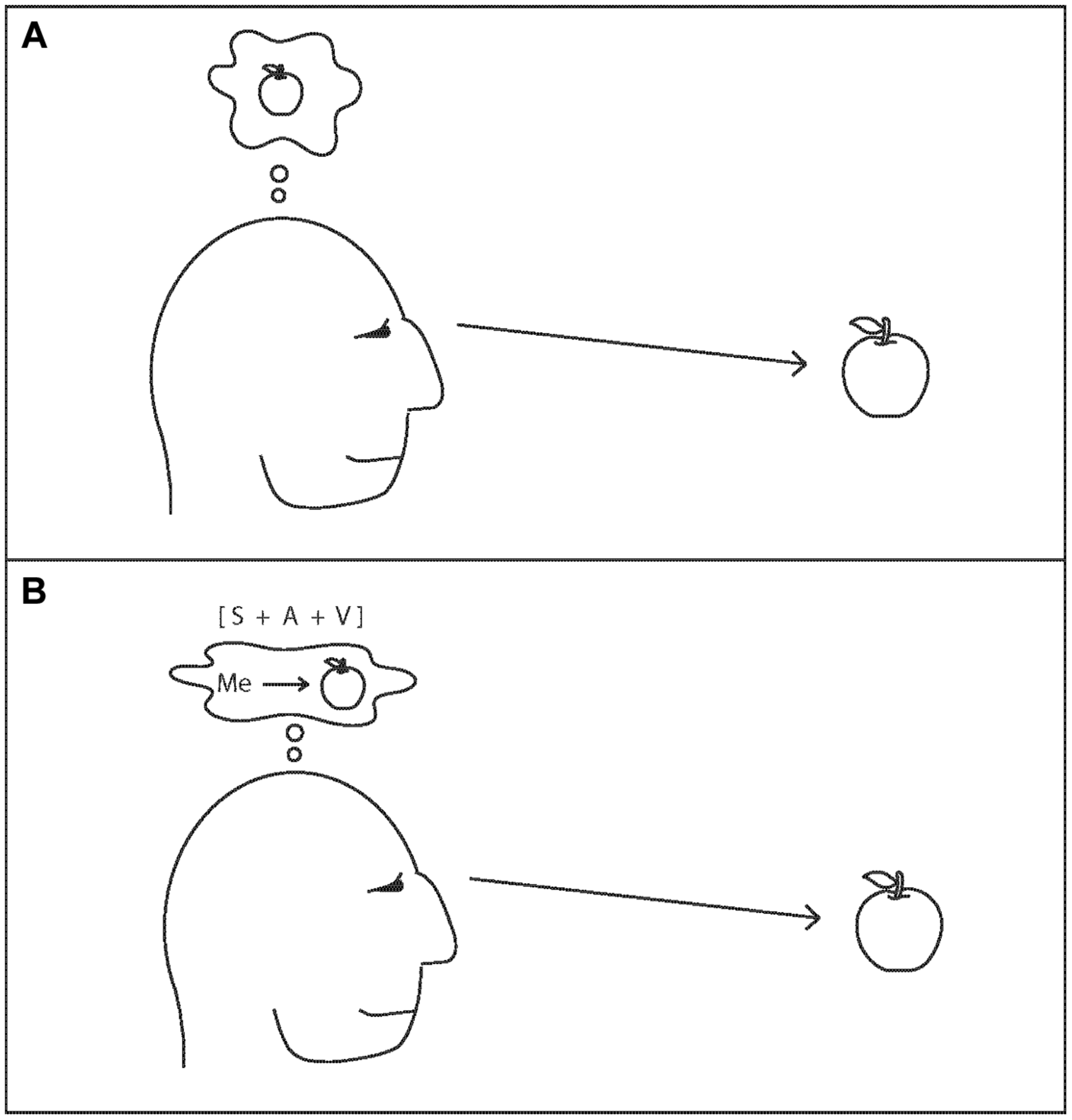 The apple, however, is only one part of a larger whole. Figure 1B illustrates a brain that has constructed a model of this larger whole. The model contains not only the visual representation of the apple (V), but also a model of the self as a physical and mental agent (S), and a model of the relationship between them: attention (A).