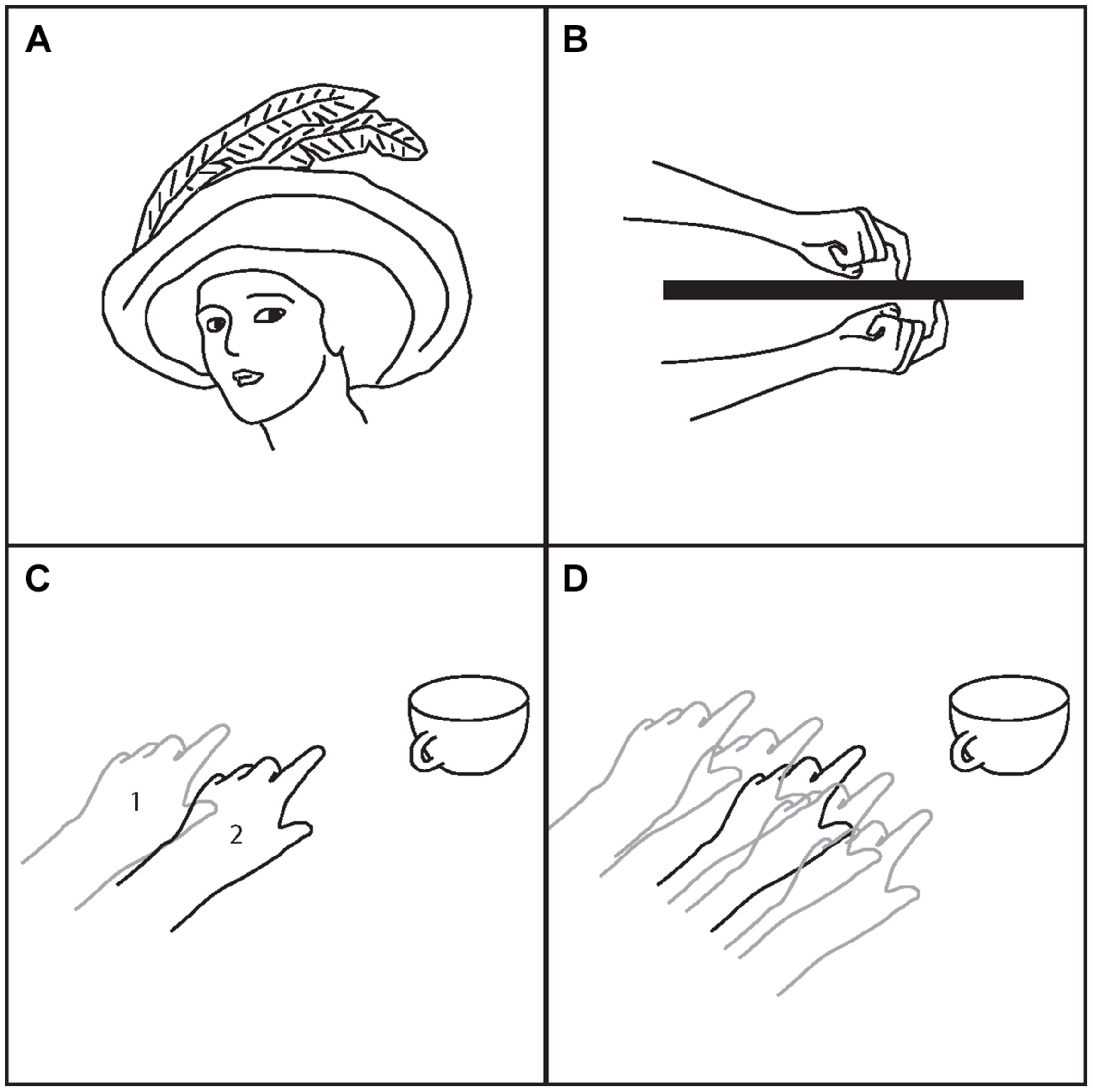 FIGURE 2. Examples of model-based control. (A) To enter a car without hitting your head requires the body schema to include an accurate model of the shape of your head. Women who wore feathered hats would develop an altered body schema to incorporate the hat, and would avoid hitting the feathers (Head and Holmes, 1911). (B) The body schema depends on visual and somatosensory input, among other sources of information. Somatosensory input, however, is less accurate than visual. If you put your left hand under the table and leave it for a few minutes, the body schema begins to lose a precise representation of arm position. It is then difficult to point with the right hand, on top of the table, to the exact location of the left hand. (C) If the hand is perturbed from point 1 to point 2, but the body schema does not register that change, reaching becomes inaccurate. In this case, the real position is closer to the cup than the position registered by the body schema. The result will be an overreach that may knock over the cup. (D) In some cases the body schema loses specificity. The position of the arm is not precisely represented. In that case maintaining a steady arm position is difficult, especially in the face of external, perturbing forces, and reaching accurately is no longer possible.
