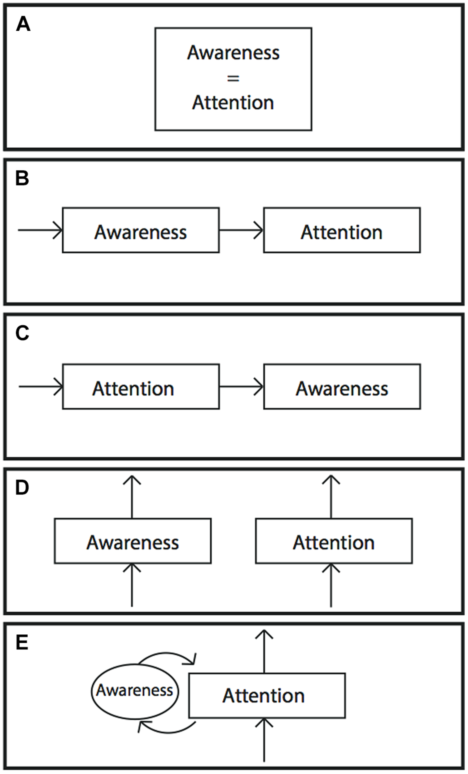 FIGURE 3. Five possible hypotheses about the relationship between awareness and attention. (A) Awareness and attention are the same. (B) Awareness precedes attention. One must become aware of something before attending to it. (C) Attention precedes awareness. One must attend to something before it can enter awareness. (D) Awareness and attention are independent processes in the brain. (E) The hypothesis proposed in the present article. In the attention schema theory, awareness is part of the control machinery for attention. It is the internal model of attention, the attention schema. Without awareness, attention is still possible but suffers from deficits in control.