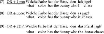 Other accounts that explain OR processing based on adult performance make similar predictions. Warren and Gibson (2002, 2005) propose that sentence processing is determined by the number of new referents that intervene between a moved element (filler) and the gap site in which it is integrated into the structure. The greater the number of intervening referents (e.g., noun phrases, verbs) the harder it is to keep track of the filler until the gap site is encountered and the filler-gap dependency is resolved [a similar idea is advanced by O’Grady (2011)]. Under this view, an intervening pronoun reduces processing cost since it does not introduce a new discourse referent: it serves as a link to an already given one. Indeed, adults have less difficulty with doubly nested ORs and object clefts whose embedded-most DP is a pronoun, as compared to cases in which all the nominal phrases in the structure are full DPs (Warren and Gibson, 2002, 2005). Other accounts explain the difficulty with ORs in terms of similarity between the DP head and the embedded subject DP. It has been found that an OR becomes easier to parse when these two constituents are sufficiently dissimilar. For instance, ORs with two full DPs are more costly to process than ORs in which the head is a full DP and the embedded subject is a proper name (Gordon et al., 2004), or a 2nd-person pronoun (Gordon et al., 2001). Other studies define the difficulties with OR processing in terms of cue-based interference (Lewis and Vasishth, 2005; Lewis et al., 2006; van Dyke and McElree, 2006). Under this view, the similarity between the DP head and the embedded DP is defined by the cues that these two constituents bear. When a constituent (e.g., the DP head in an OR) is encountered it is encoded in memory. Later on, in the gap position, it has to be retrieved from memory in order to be integrated into the structure. At this point, its (syntactic, semantic, or other) cues are analyzed in order to decide whether the filler-gap dependency can be resolved. If another constituent (e.g., the embedded subject DP in an OR) shares similar cues with those of the encoded constituent this second set of cues will interfere with the processing of the first one, increasing the overall processing cost of the structure. In an OR with an embedded pronoun, the cues of the intervening pronoun are sufficiently different from those of the encoded head noun, thus reducing the processing cost.