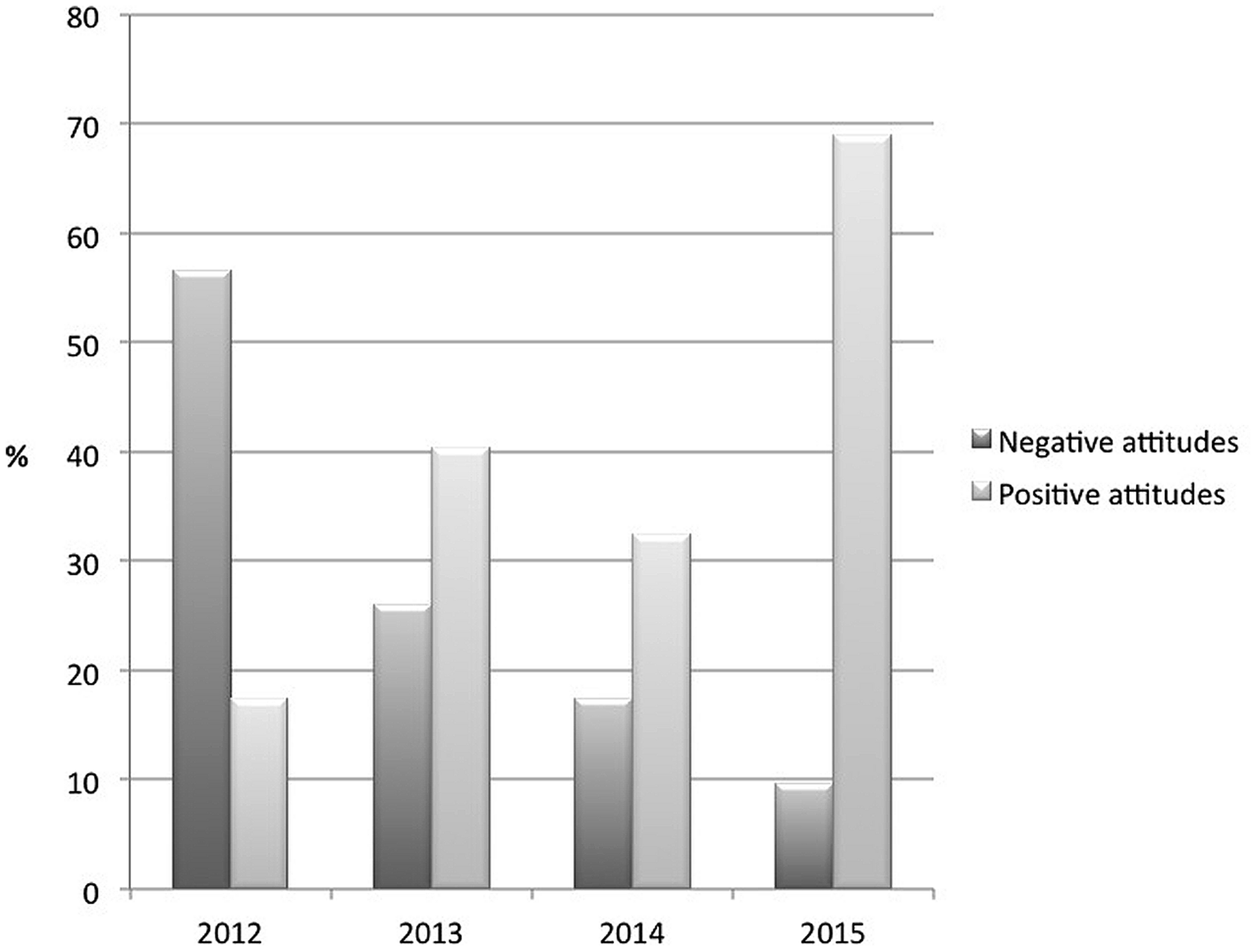 FIGURE 1. Polarization of attitudes toward hen was reversed from 2012 to 2015. ‘Negative attitudes’ = 1 and 2 on the rating scale; ‘positive attitudes’ = 6 and 7 on the rating scale.