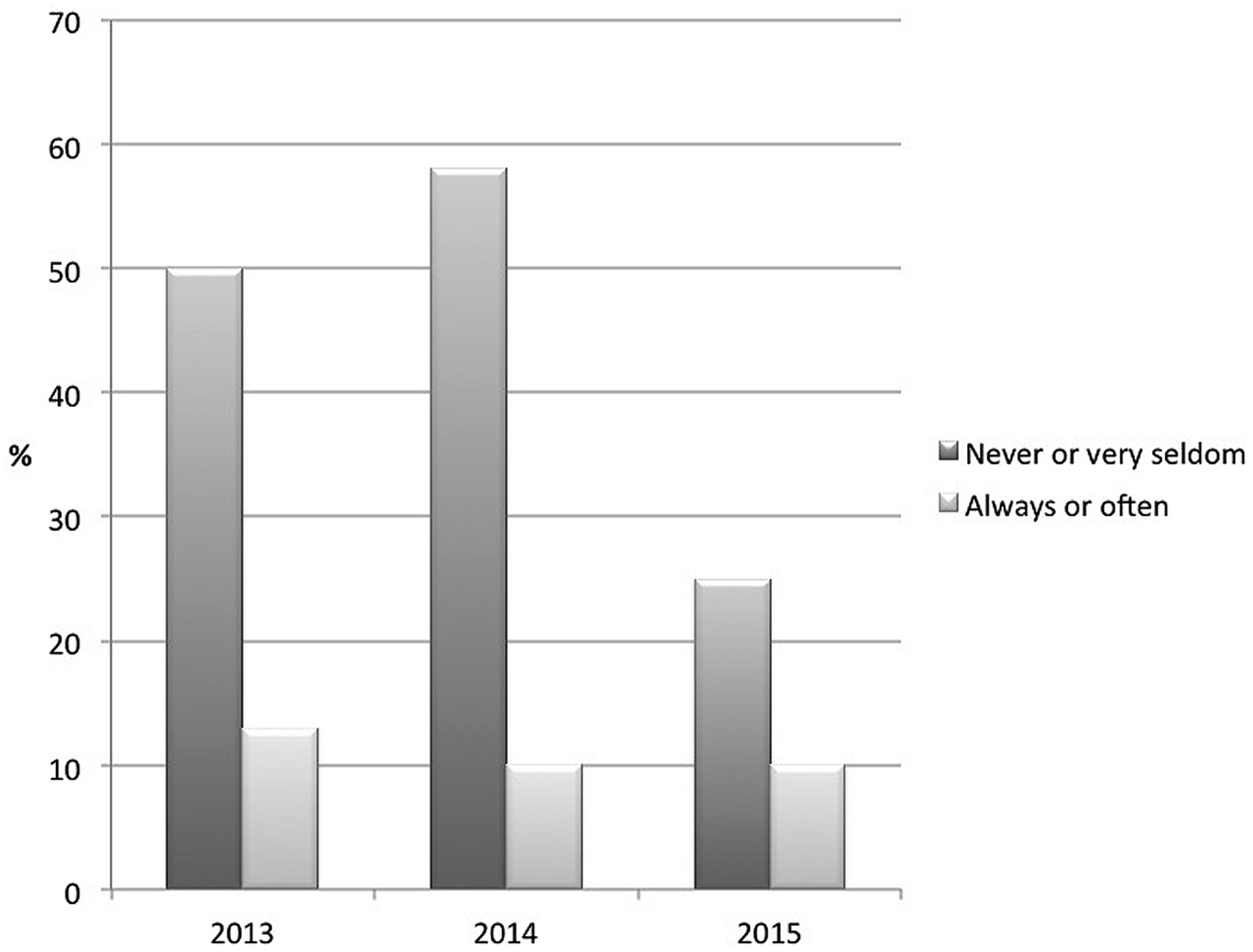 FIGURE 2. Change in usage of a gender-neutral pronoun from 2013 to 2015. ‘Never or very seldom’ = 1 and 2 on the rating scale; ‘Always, or often = 6 and 7 on the rating scale.