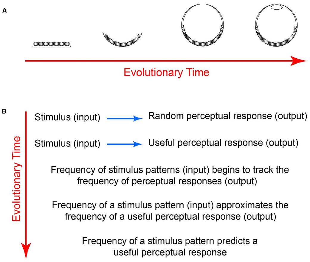 How the frequency of occurrence of stimulus patterns comes to predict perceptions. (A) Evolution of biological photodetectors from patches to image forming eyes. (B) Evolution of associations, indicating why the frequency of occurrence of rewarded stimuli eventually predicts perceptions. Early in visual evolution, different behaviorally important input patterns would be associated with responses more or less randomly. As evolution progressed, however, visual inputs would have been gradually linked to perceptual and other outputs based on survival and reproductive success. As a result, the frequency of occurrence of stimulus patterns is automatically tied to the frequency of occurrence of useful percepts.
