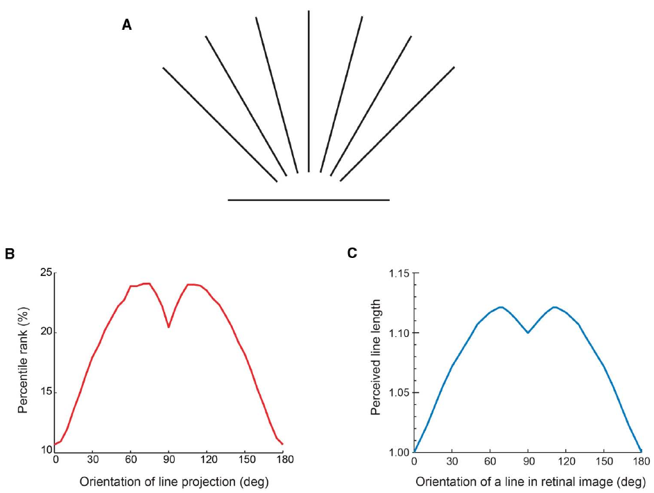 The evidence that visual perceptions are indeed a consequence of evolved associations between recurring input patterns and responses made on the basis of empirical reward is that the frequency of occurrence of stimulus patterns predicts perceptual experience (Purves and Lotto, 2011; Purves et al., 2014). Consider, for example, the perception of the ruler mentioned earlier. Perceptions of line length—or spatial intervals generally—has long been puzzling in that a projected line of the same measured length (e.g., the edge of the ruler) appears to have different lengths depending on its orientation (Figure 3A; Howe and Purves, 2002, 2005).