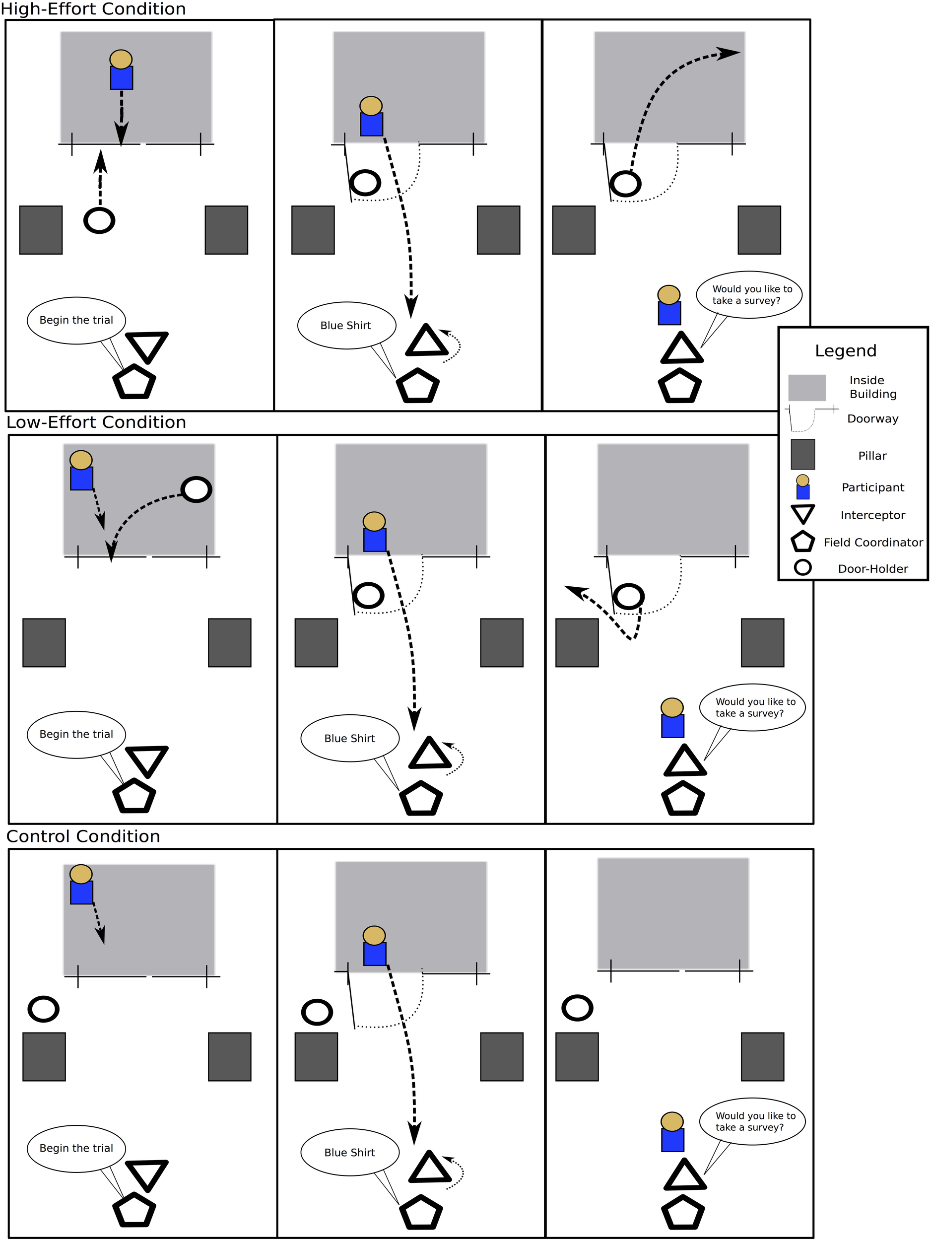 After the participant exited the building he or she was approached by another experimenter, in this case a tall college-aged male–who was the interceptor. The interceptor stood 20 feet from the doorway with a clipboard and a stack of surveys. Before the trial, the interceptor stood facing away from the door–to prevent him from seeing the condition of the trial, thus keeping him blind to the condition of how much effort was spent to hold the door. The field coordinator stood close to the interceptor, facing the doorway to view the trial. When the door-holder identified a valid participant, she would hold the door in the appropriate condition. In the low-effort condition (where the experimenter was exiting the building in the same direction as the participant), the door-holder immediately hid behind a pillar after leaving the building to prevent being seen by the interceptor so as to not reveal to him the type of condition being conducted. The interceptor never saw the door-holder during a trial. After the door was held for a participant, the field coordinator would whisper to the interceptor a brief description of the participant (i.e., “blue shirt”), after which the interceptor would turn around and approach the participant. The interceptor would then ask the participant if he or she would like to take a survey. The interceptor was trained to say this phrase in the same way with the same intonation and body language in all trials. Both the interceptor and door-holder wore the same outfits during all data collection sessions.