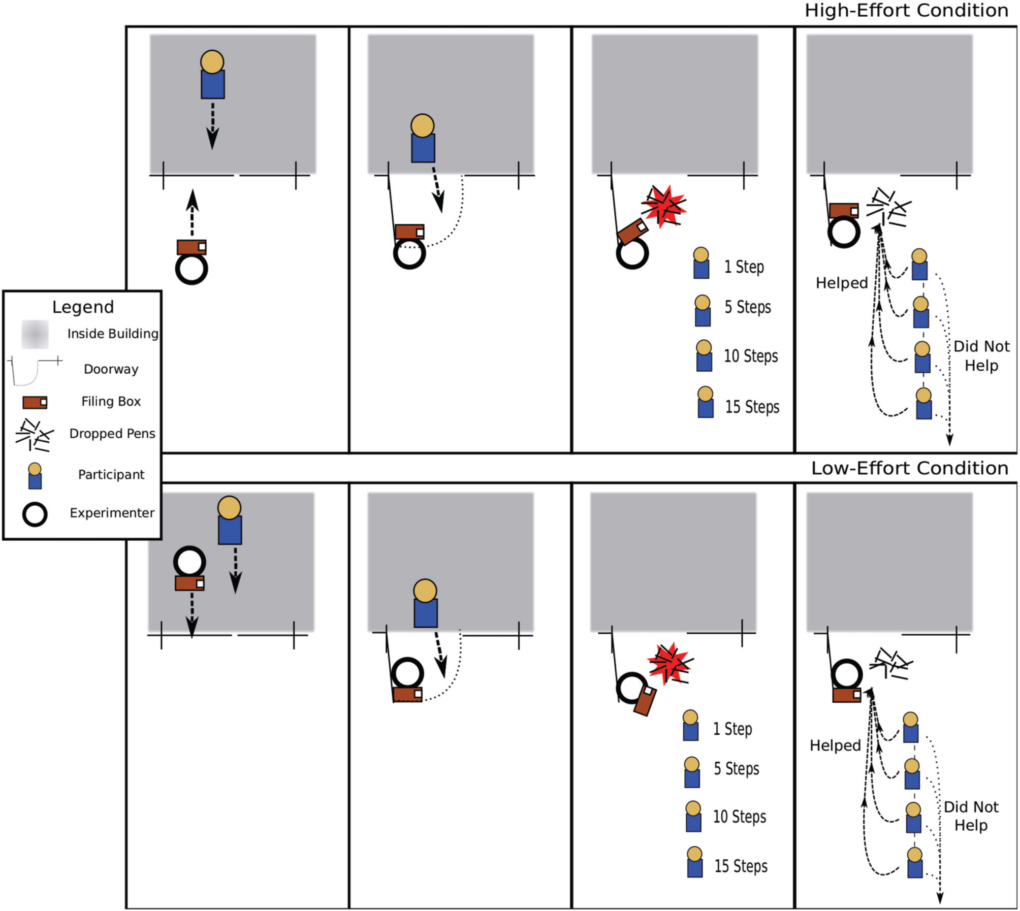 In this experiment, the experimenter held the door and needed help from the participant. The door-holder in this experiment was holding a filing box with two handles on each side and a removable lid with a box containing 12 pens resting on top. To facilitate data collection, two different experimenters played the role of the door-holder/interceptor and each collected data in separate parts of campus. Both experimenters were Caucasian males, 6′3″ tall, of lean build, similar skin tone and facial bone structure, and also similar to the interceptor in Study I. The experimenter held the door for the participant in either a low-effort or high-effort condition. In the low-effort condition, the experimenter walked in front of the participant in the process of exiting a building and propped the door open with his shoulder while looking down at his cell phone. Again, the door-holder timed the door-holding such that the participant's path and speed to exit the building was unaltered. In the high-effort condition, the experimenter approached again from the outside of the building and held the door open with his free hand while the participant exited the building. (See Figure 2, for a diagram detailing how these trials were conducted).