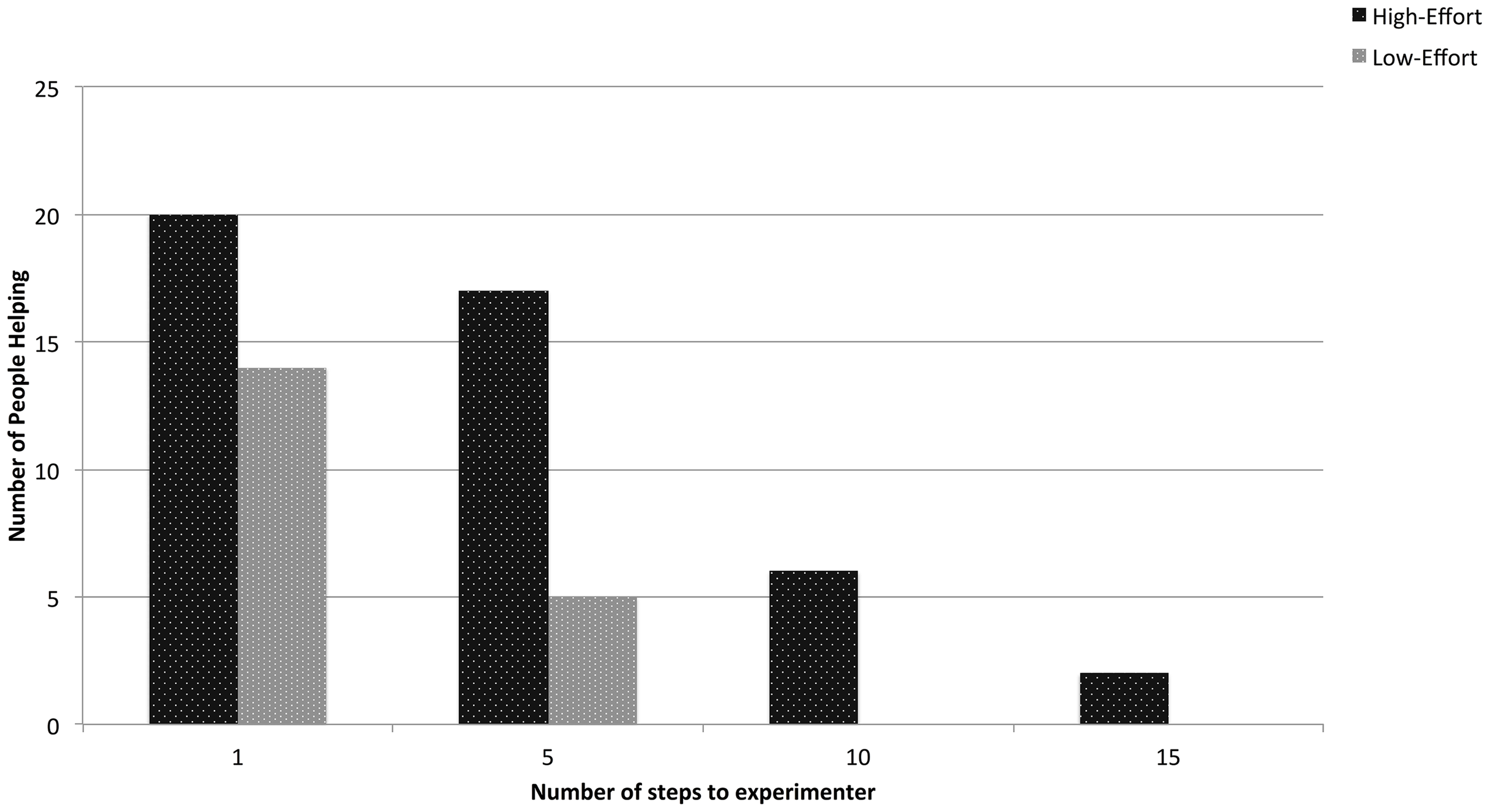 Figure 3. Overall helping decreased with distance. Individuals in the high-effort condition were statistically more likely to help than individuals in the low-effort condition at each distance.