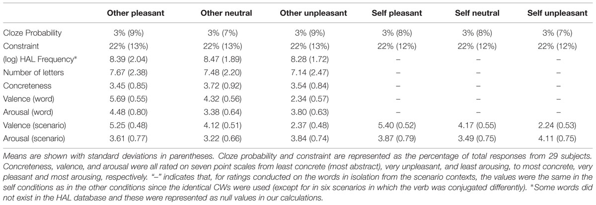A series of norming studies of the stimuli were carried out via the internet. Inclusion criteria for participants in these ratings studies were the same as for the ERP experiments (see above). Means and standard deviations of all norms and ratings can be found in Table 2. Statistical analyses for CW length, CW concreteness, cloze probability, and constraint can be found in Fields and Kuperberg (2012). Briefly, stimuli were matched across conditions on all these features, except for concreteness where neutral words were slightly more concrete than pleasant and unpleasant words (this did not account for the unique effects of self-relevance on neutral words under the production task, see Fields and Kuperberg, 2012).