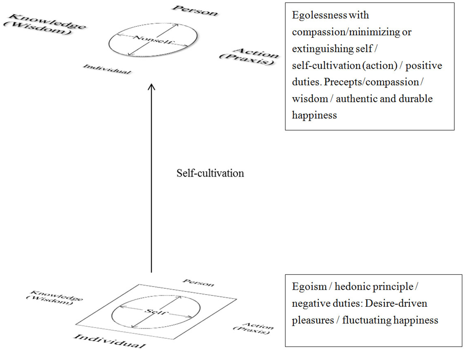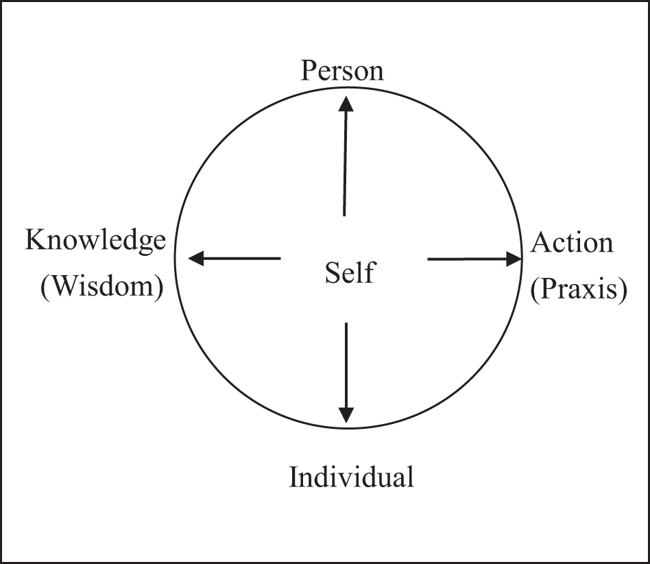 In Figure 1, the self resides inside a circle located between two bi-directional arrows: One end of the horizontal arrow points to “action” or “praxis”; the other end points to “wisdom” or “knowledge.” The top of the vertical arrow points to “person,” and the bottom points to “individual.” All four of these terms are located outside the circle but within the square. This arrangement of the concepts means that the self is being influenced by forces from the individual's external environment.