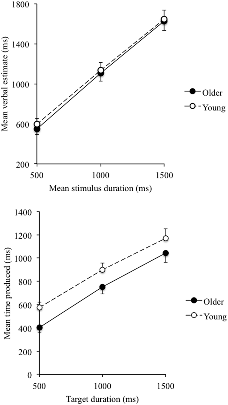 FIGURE 1. Mean verbal estimates (upper) and mean time produced (bottom) plotted against stimulus duration in young and elderly people.