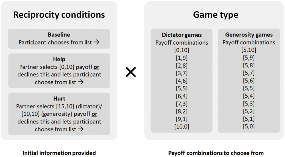To summarize, this experimental setup would thus reveal an effect for generosity if there were greater allocations in the generosity games relative to the dictator game (i.e., a main effect for game type). In addition, reciprocity would be evident from varying allocations of wealth between the baseline, help, and hurt games (i.e., a main effect of reciprocity), in which higher allocations in the help games would be indicative of positive reciprocity and lower allocations in the hurt games indicative of negative reciprocity.
