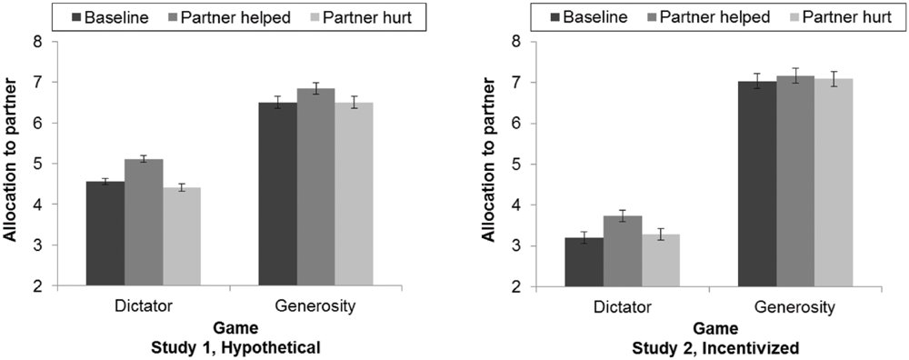 Mean allocations to partner across all games. Error bars represent one standard error. N = 304 (Study 1), 256 (Study 2).
