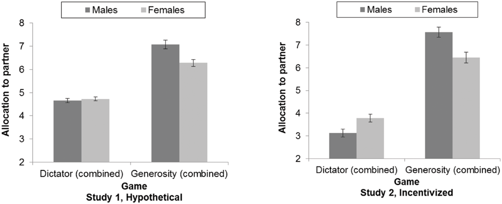 Mean allocations to partner by game type and gender. Data are collapsed across reciprocity conditions. Error bars represent one standard error. N = 301 (Study 1), 256 (Study 2).