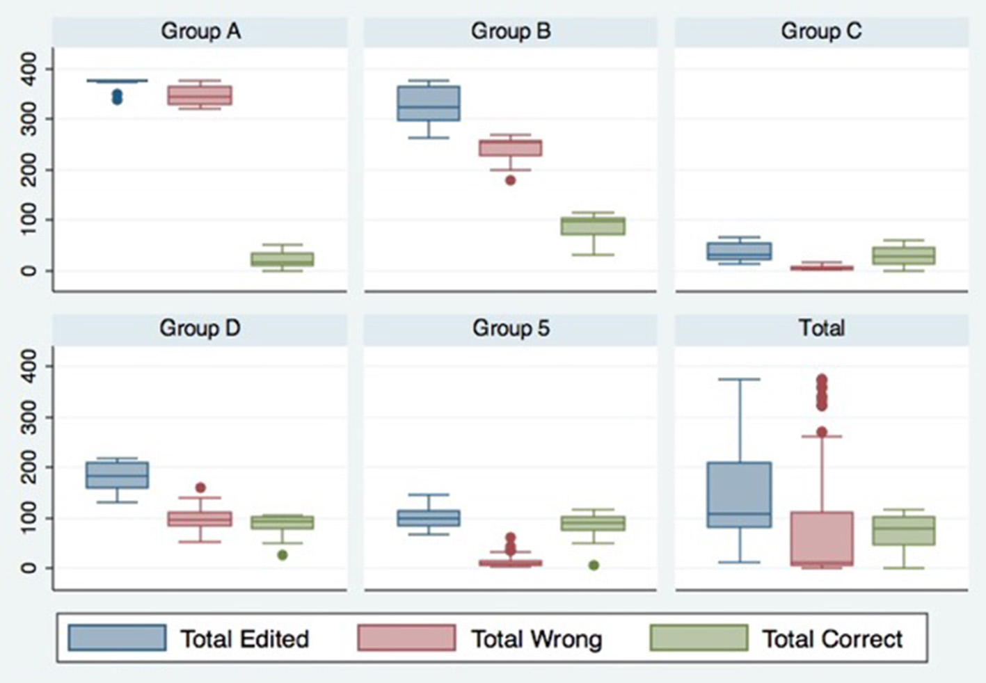 In the primary experiment, expert subjects could edit correctly or incorrectly. We will focus our analysis on six experimental actions: total edits, total incorrect edits, percentage wrong, net impact on the customer earnings, expert earnings, and total editing time taken. Total edits (total incorrect) is the sum of all (incorrect) edits made by the expert over four rounds of editing. Percentage wrong was calculated by dividing total incorrect by total edited. Cumulative impact on the customer earnings, or impact, was calculated as the customer payoff generated by the expert's behavior over all four rounds. As subjects were given the opportunity to leave the experiment early, total time taken is the amount of time the experts spent editing the essays across all four rounds.