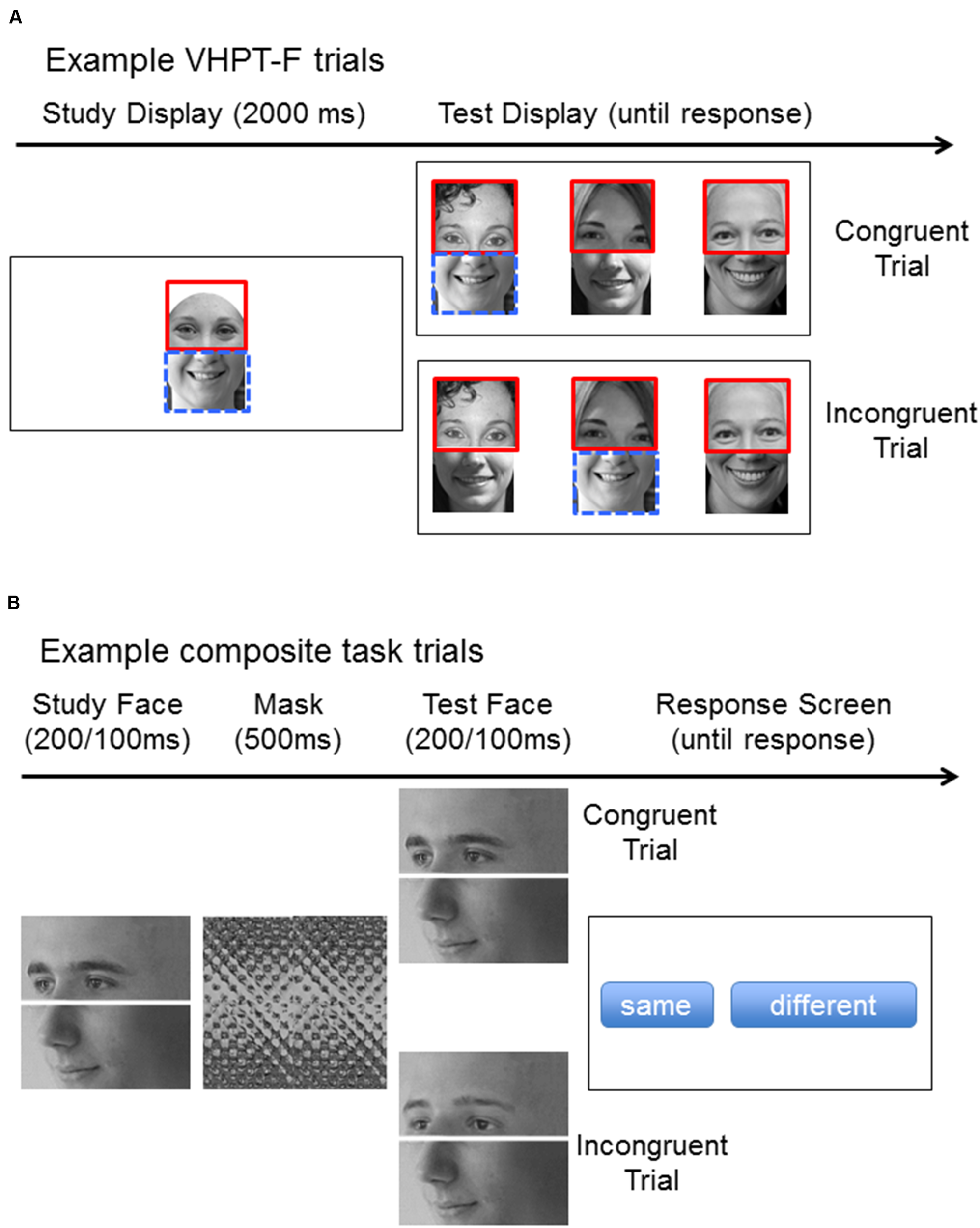 (A) Example VHPT-F trials where the top face half is the target. The correct response is the face on the left. On congruent trials, the target part is paired with the distractor as during study. On incongruent trials, the target part is paired with a new distractor part, and the distractor part from the study face is paired with a foil (the task-irrelevant part of the study face is outlined in blue here for illustrative purposes only). (B) Example composite task trials. In these examples, the bottom is the target part and the correct response is “same.” On congruent trials, the target and distractor face halves are associated with the same response (“same” in this example). On incongruent trials, the face halves are associated with different responses (in this example, the bottom half is “same” but the top half is “different”).