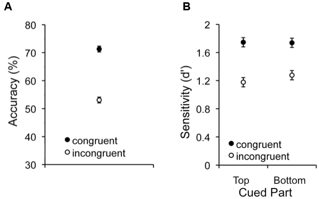 In Experiment 1, we only tested male participants. When, we restricted our analyses in Experiment 2 to only male participants (n = 47), we found significant correlations between holistic processing in the VHPT-F and both composite task measures that were comparable in magnitude to the correlations in Experiment 1 (congruency effect: r45 = 0.29, rdisattenuated = 0.498, p < 0.05; alignment effect: r45 = 0.35, rdisattenuated = 0.49, p < 0.05). These correlations were not significant for female participants (n = 68; congruency effect: r66 = 0.05, rdisattenuated = 0.08, p = 0.68; alignment effect: r66 = 0.05, rdisattenuated = 0.08, p = 0.68). However, differences between correlations in male and female participants were not significant (zs < 1.6, ps > 0.10). The congruency effect and alignment effect in the composite task were significantly correlated in both male (r45 = 0.54, rdisattenuated = 0.83, p < 0.001) and female (r65 = 0.43, rdisattenuated = 0.66, p < 0.001) participants.
