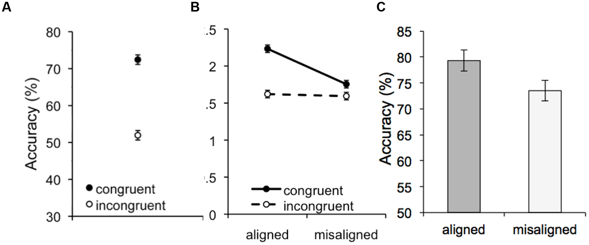 On average, we observed a reverse alignment effect (better performance in aligned than misaligned trials). This replicates findings in a study (n = 101) that also measured the alignment effect (hit rate for same-incongruent trials) in the context of the composite design used to measure congruency effects (complete design) with different face stimuli and a larger set of face parts (Ross et al., 2015). A meta-analysis of the alignment effect in 28 studies that used the complete composite task found the effect to be small ( = 0.14, 95% CI: 0.07, 0.22) and the effect to be significant in only 25% of the studies (Richler and Gauthier, 2014). Whether this is true only when the alignment effect is measured in the context of the complete design, suggesting it is highly sensitive to context, or whether the report of alignment effects has been overestimated due to publication bias, we do not know.