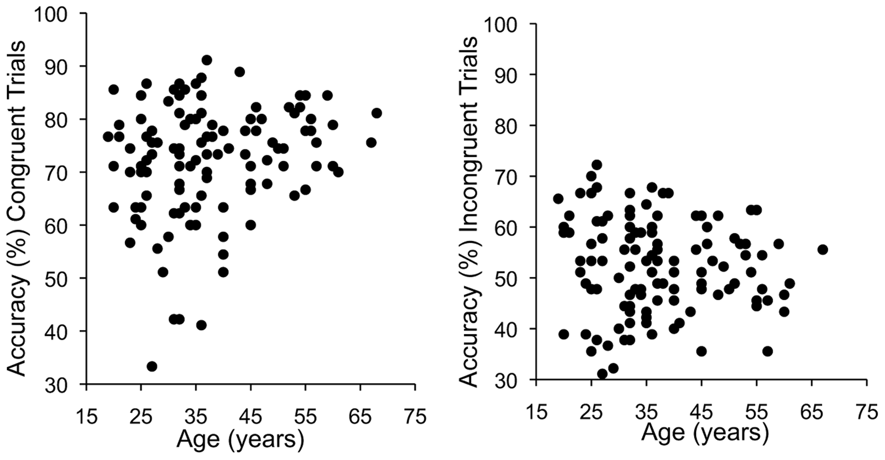 Correlation between age (years) and accuracy on congruent (Left) and incongruent (Right) VHPT-F trials.