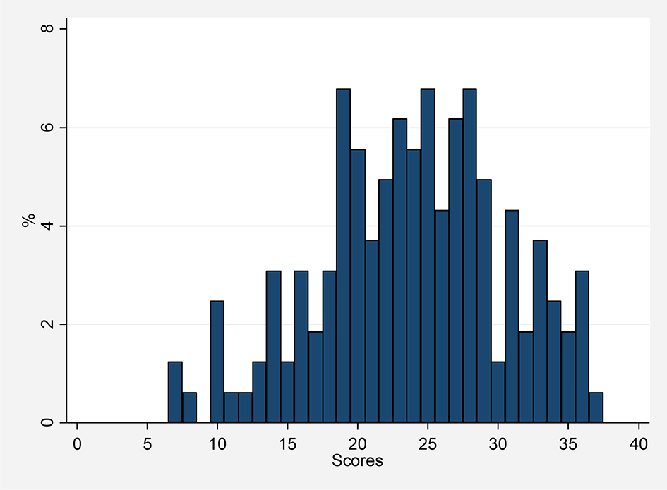 Figure 1 presents the distribution of the number of observed correct answers to the 40 multiple choice items in the DAT-AR test. The mean and the median number of right answers were 23.9 and 24 out of 40, respectively, and the standard deviation was 6.7. Mean and median number of correct answers are almost identical to the ones calculated for the Spanish population of a comparable age (Cordero and Corral, 2006).