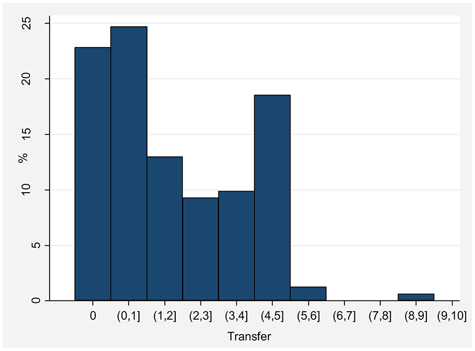 Figure 2 shows the distribution of the transfers in the Dictator Game. About 80% of our subjects gave non-zero amounts. The mean and median transfer were of 2 and 1.4€ out of 10€, respectively, and the standard deviation was almost 2€. Comparing these results with the range of outcomes in the dictator game meta-analysis of Engel (2011), our values are within the range of what is typically observed (dictators on average give 28.35% of the pie).