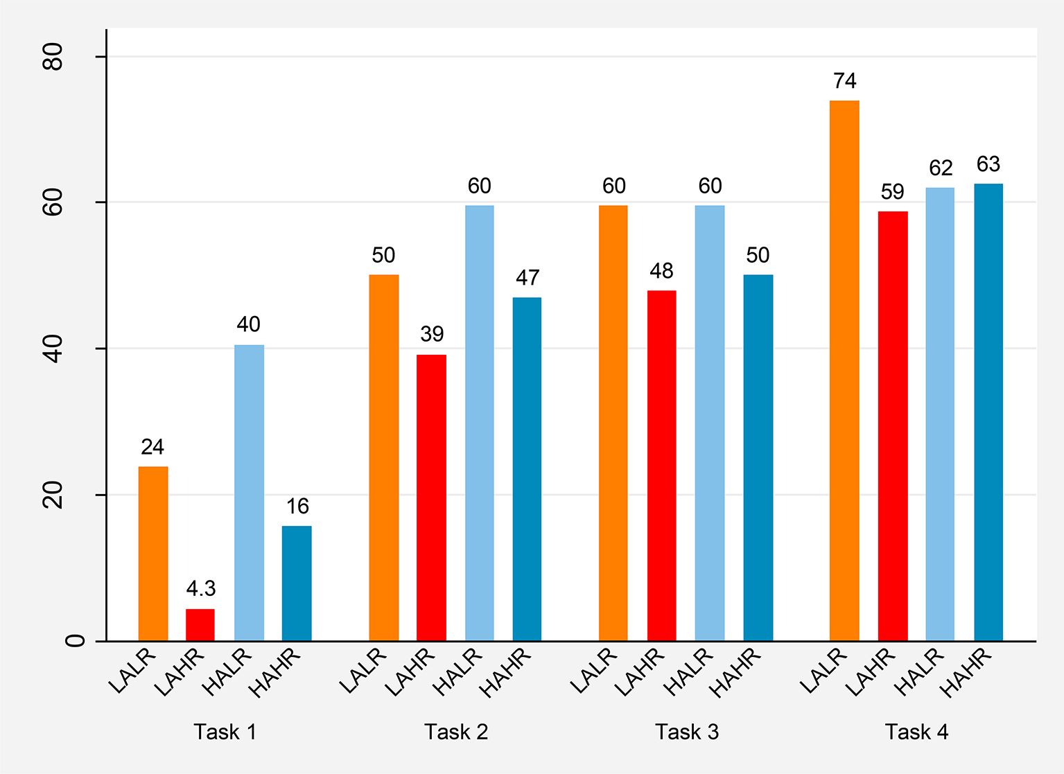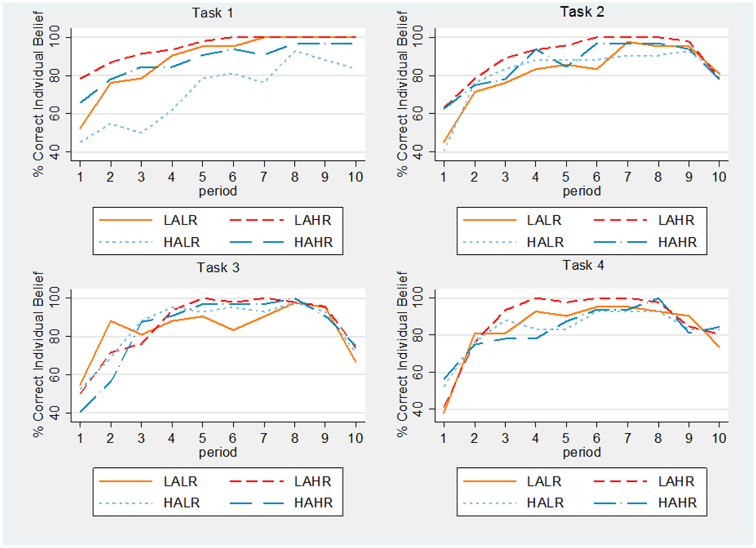 The elicitation of beliefs allows us to measure the number of individuals who have correctly guessed their partner's behavior in any given period, that is, they expected cooperation and the other has indeed cooperated, or they expected defection and the other has defected. Dividing this number by the total number of individuals in the treatment, we obtain the percentage of correct beliefs for each task, period and treatment (presented in Figure 4). According to Hypothesis 2 in the Introduction, we should observe that individuals with higher cognitive ability better forecast their partner's behavior. The percentage of correct individual beliefs is significantly higher for high reasoning ability subjects in the first four repetitions of the one-shot game (see Table SM2.5 in the Supplementary Material) and in the first period of task 2. In particular, LAHR participants reach 100% accuracy in almost half of the periods in all tasks, more often than the other treatments. However, there are no systematic differences in the remaining periods and tasks (Tables SM2.6–SM2.8 in the Supplementary Material). In the RPD tasks, the percentage of correct guesses is above 80% for most periods, for all treatments.