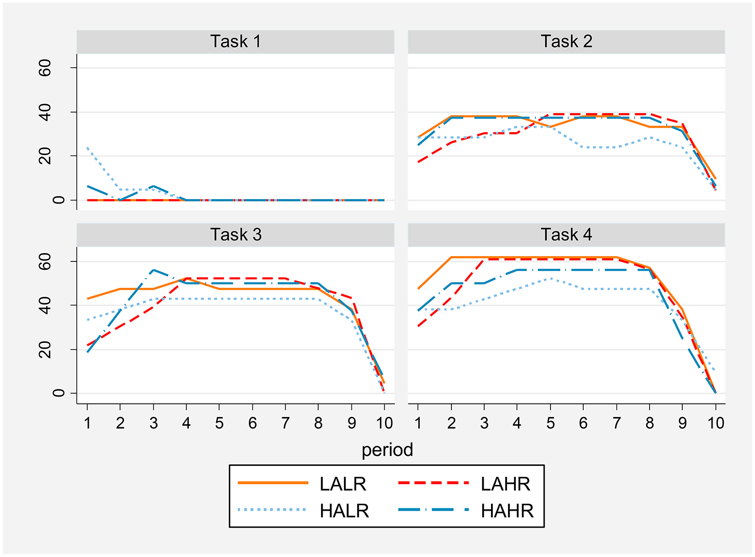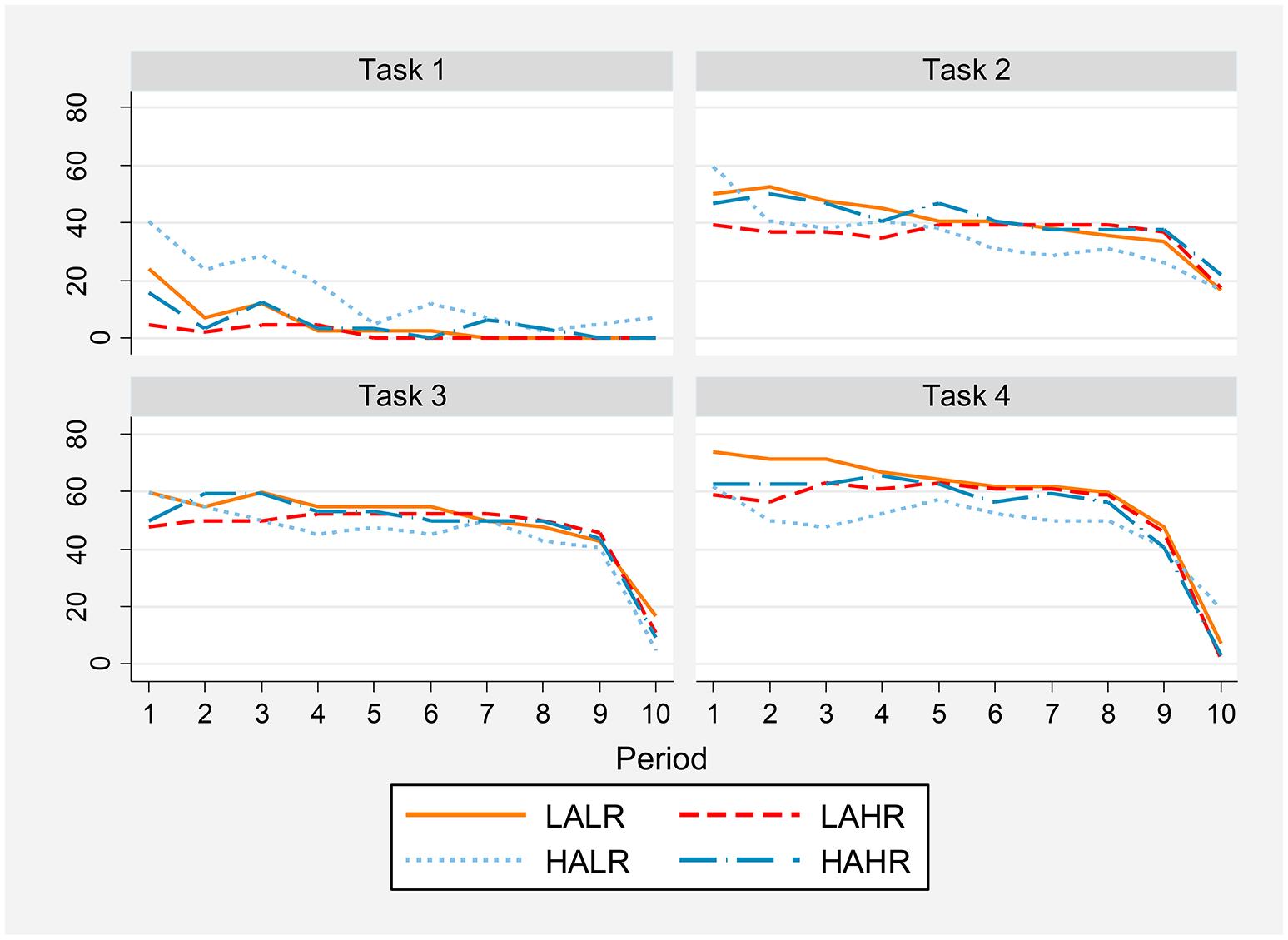 In the first period of each RPD task we observe that HALR individuals continue to have the most positive expectations about partner cooperation, while LAHR subjects are the most pessimistic, this difference being significant for tasks 2, 3, and 4 (see the proportions tests results in Tables SM2.2–SM2.4 in the Supplementary Material). However, these treatment differences level off over time within each RPD game.