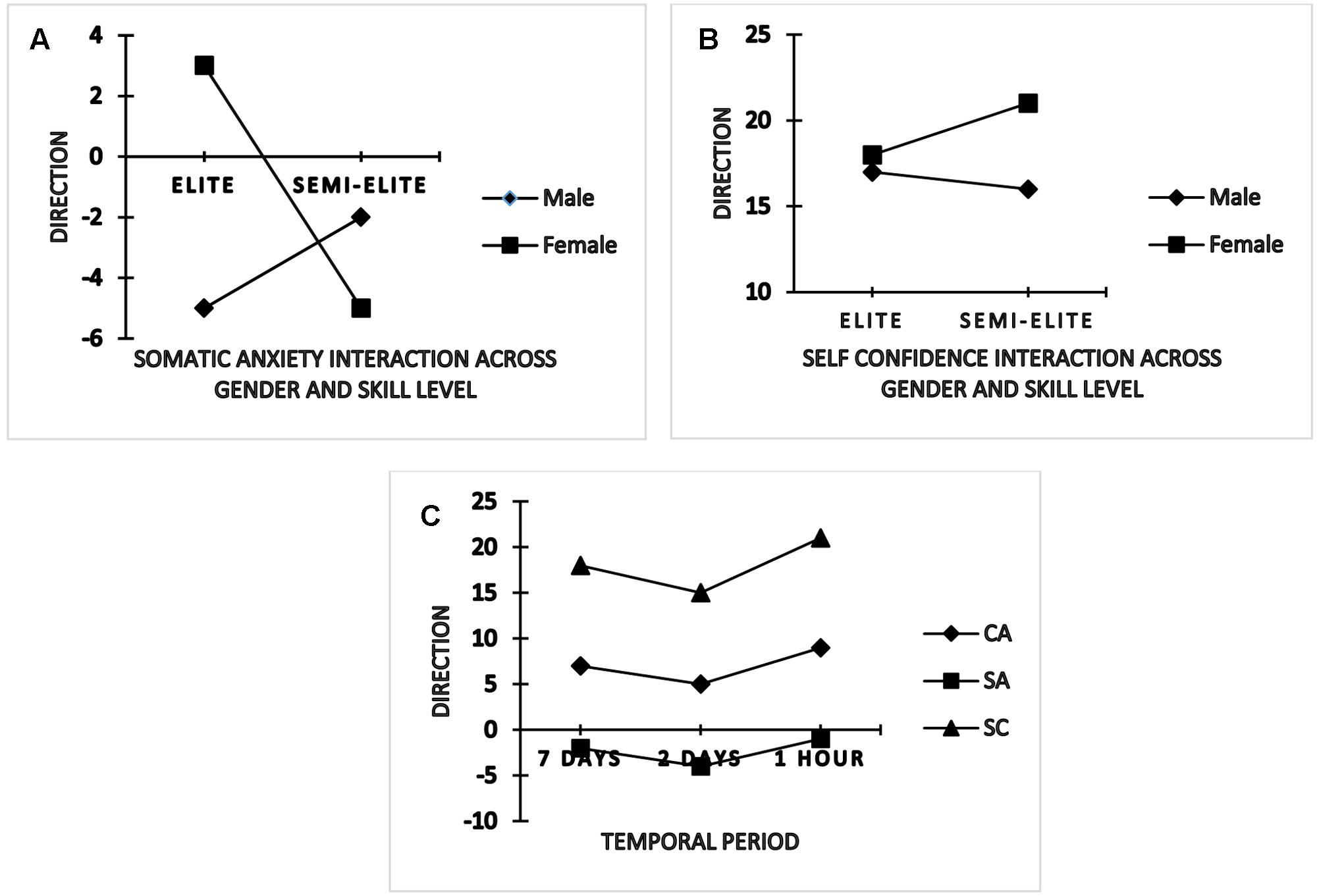 Also, time-to-event main effects were noted in the direction dimension, Pillai’s trace = 0.940, F(5,82) = 2.950, p < 0.001, = 0.94, with within-subject ANOVA showing changes for cognitive state anxiety, F(2,172) = 16.956, p < 0.001, = 0.16, somatic state anxiety, F(2,172) = 14.824, p < 0.001, = 0.14 and self-confidence, F(2,172) = 15.867, p < 0.001, = 0.94. Corrected t-tests further showed directional perception of cognitive state anxiety becoming more facilitative 1 h before competition whereas somatic state anxiety debilitative interpretation was more pronounced 2 days prior to the event but slightly improved 1 h before competition. Self-confidence displayed was quite high 1 h compared to the other days prior to competition (Figure 2C).