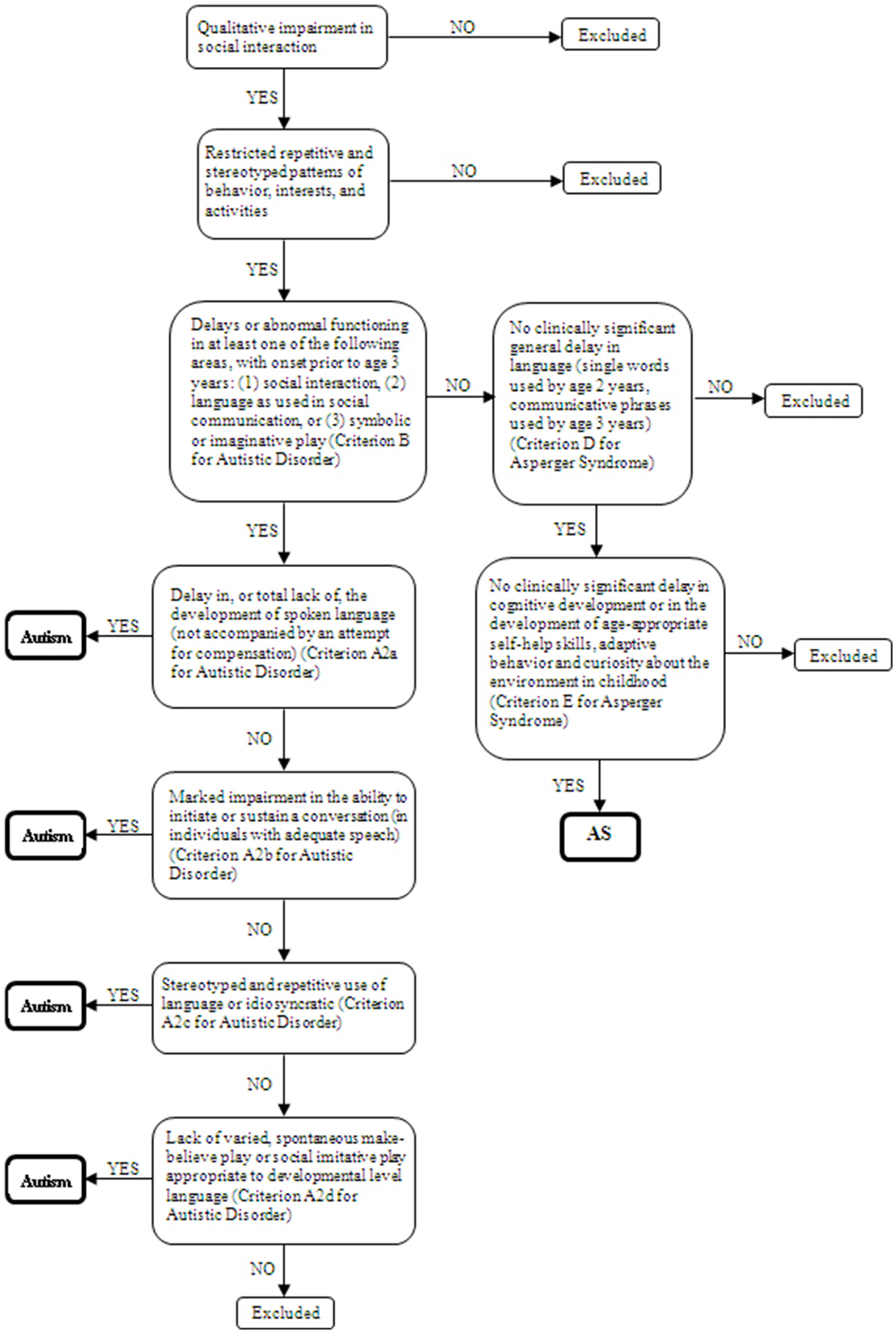 Decision tree based on the DSM-4 criteria for autism and Asperger Syndrome classification.