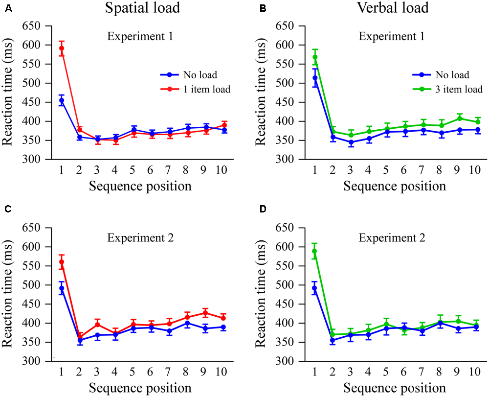 Plots of reaction time as a function of condition and sequence are shown in Figure 2. A 3 (condition) × 10 (sequence) ANOVA showed, as in Experiment 1, significant effects of condition [F(2,58)= 5.2; p < 0.02, η = 0.15], sequence [F(9,261)= 83.0; p < 0.001, η = 0.74], and a condition × sequence interaction [F(18,522)= 7.2; p < 0.001, η = 0.20]. Separate comparisons of the conditions showed that both spatial [F(9,261)= 6.6; p < 0.001, η = 0.19] and verbal load [F(9,261)= 13.1; p < 0.001, η = 0.31] interacted with sequence. Thus, unlike Experiment 1, where spatial but not verbal load interacted with sequence, here reaction times to the first stimulus after encoding under spatial or verbal load were both substantially longer than in the no load condition.