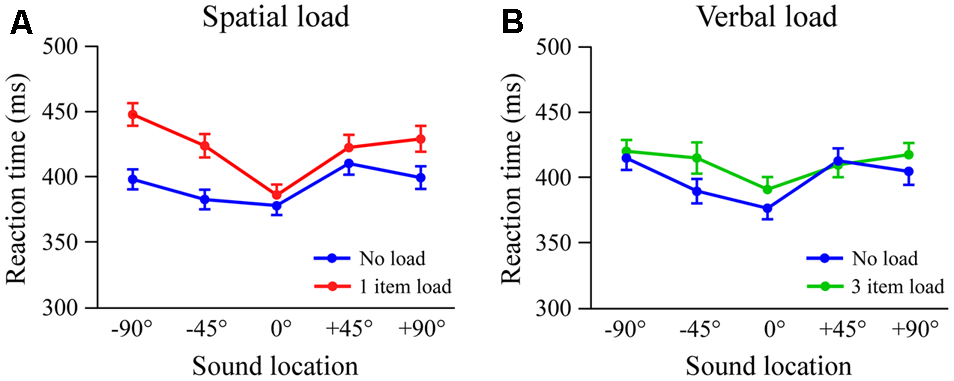 Combined results from Experiments 1 and 2 (n = 60). Reaction time as a function of stimulus location in spatial (A) and verbal (B) load conditions. Error bars indicate 1 SEM.