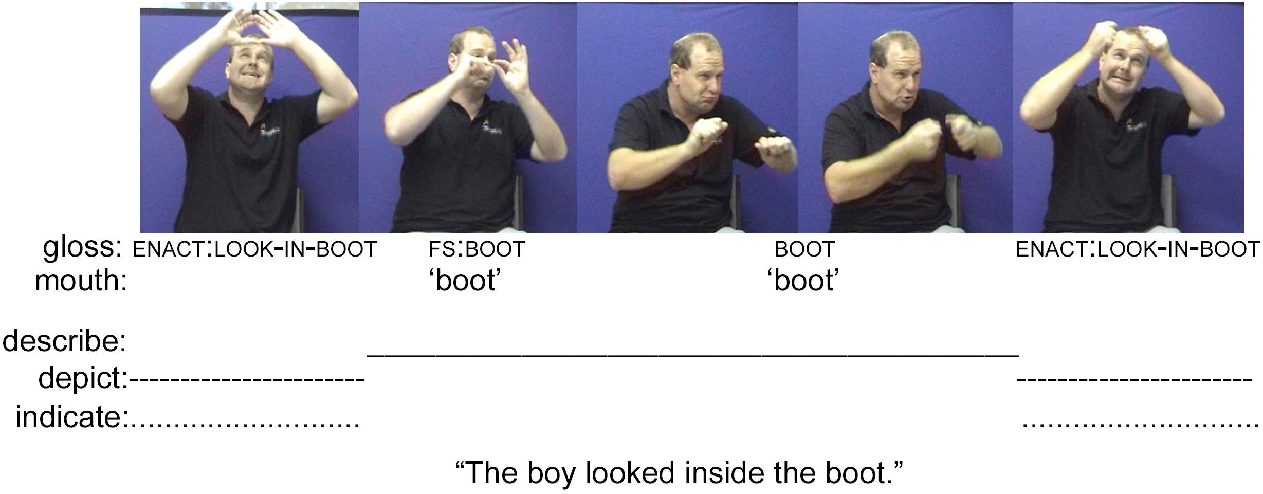 A first example of a composite utterance evidenced in a deaf/deaf interaction is produced by a deaf Auslan signer re-telling Frog, Where Are You? (Mayer, 1969) to another deaf signer (Figure 1). During the story, a little boy searches for his missing pet frog. In retelling one moment of the story, the signer produces a composite utterance that both depicts and describes the boy as he picks up a boot and looks inside it. The signer begins with an enactment of the boy holding something over his head (i.e., a depiction), using eye gaze and facial orientation to index an as-yet un-named referent to a specific location in the signing space. This enactment is followed by a fingerspelled English word (‘boot’) and the lexical Auslan sign BOOT (i.e., a description of the object held by the boy). The signer completes his move with another enactment of the boy holding up the boot and looking into it (again, simultaneously depicting the event and indexing referents within the event). In this way, the signer coordinates different acts of description, indication, and depiction to create a composite utterance recounting a moment in the boy’s search for the frog. The initial enactment is elaborated retrospectively through the description of the referent ‘boot’ in both English and Auslan. The second iteration of the enactment enables the signer’s interactant to once again perceive what happened, but with clarified knowledge about the imagined object the boy (or rather, the signer as boy) was holding. In this composite utterance, the descriptions, indications, and depictions are essential to understanding the meaning. Without the depictions, for example, all that would remain is a (bilingual) description of the referent ‘boot,’ which does little to move the story forward. In this example, we see that the availability of bodily enactment precludes the need to formulate a description through fully conventionalized lexis and grammar. We contend that such practices, based in the essentially face-to-face nature of interaction, have been able to fundamentally shape the signed languages of deaf communities (Johnston, 1996).