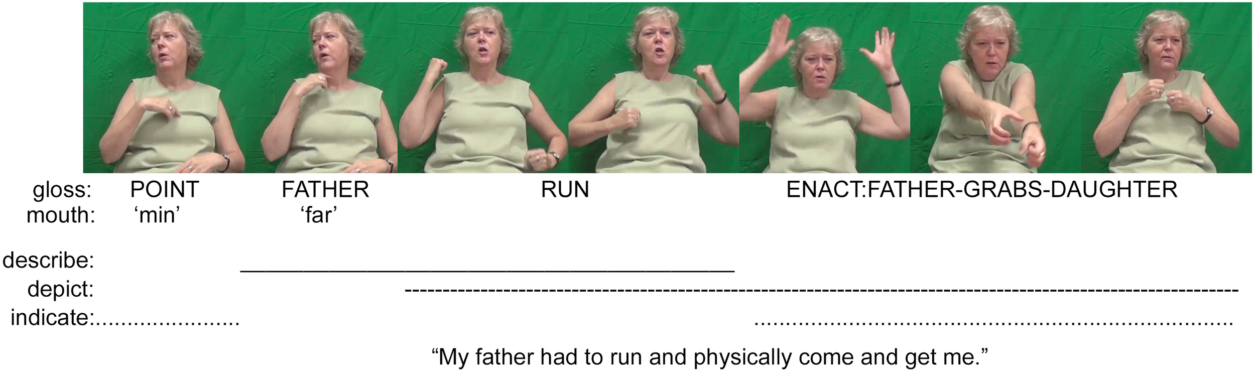A second example further illustrates the nature of signed language communication by detailing a composite utterance produced as part of an informal conversation between three deaf Norwegians (Figure 2). The signer has almost finished detailing a personal experience about her childhood. She recounts how her father would have to physically come and find her when she was out playing, because she could not hear his calls. Her utterance begins with the signs POINT FATHER, thereby naming ‘father’ as the actor referent. The pointing action serves to index her own father, as opposed to someone else’s. The signer then elaborates her father’s actions by exploiting the gradient properties of the fully conventionalized sign RUN to express how her father would have to run (and find her). Her skillful manipulation of this lexical sign has the effect of profiling both descriptive and depictive elements of her expression. She ends this composite utterance by enacting her father as he ran to her, reached out and physically took hold of her, thus also indexing her young self as a referent through eye gaze and meaningful use of space. This depiction (which essentially functions as a verb) is framed by the phrase that both indicates and describes her father as the actor referent. As in the Auslan example, these descriptions, indications, and depictions are all integral to the intended meaning and must be interpreted holistically. If we were to focus only on the most conventionalized aspects of this utterance, i.e., the descriptive signs FATHER and RUN, then we would be left with only a partial understanding and analysis.