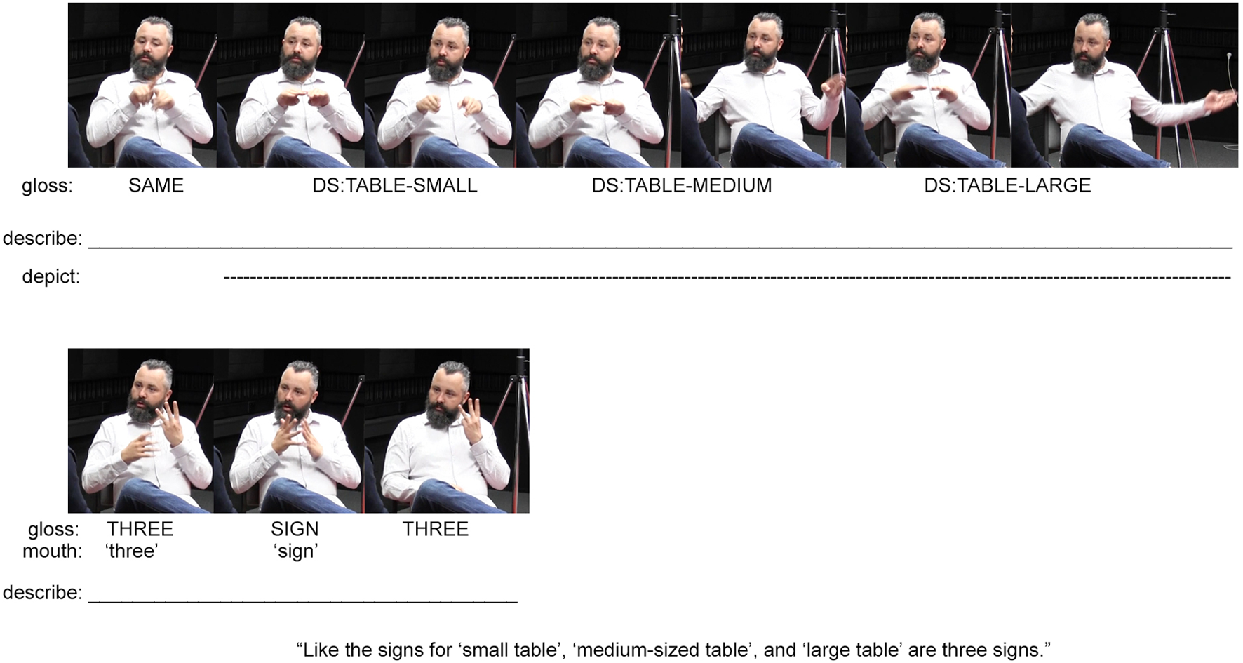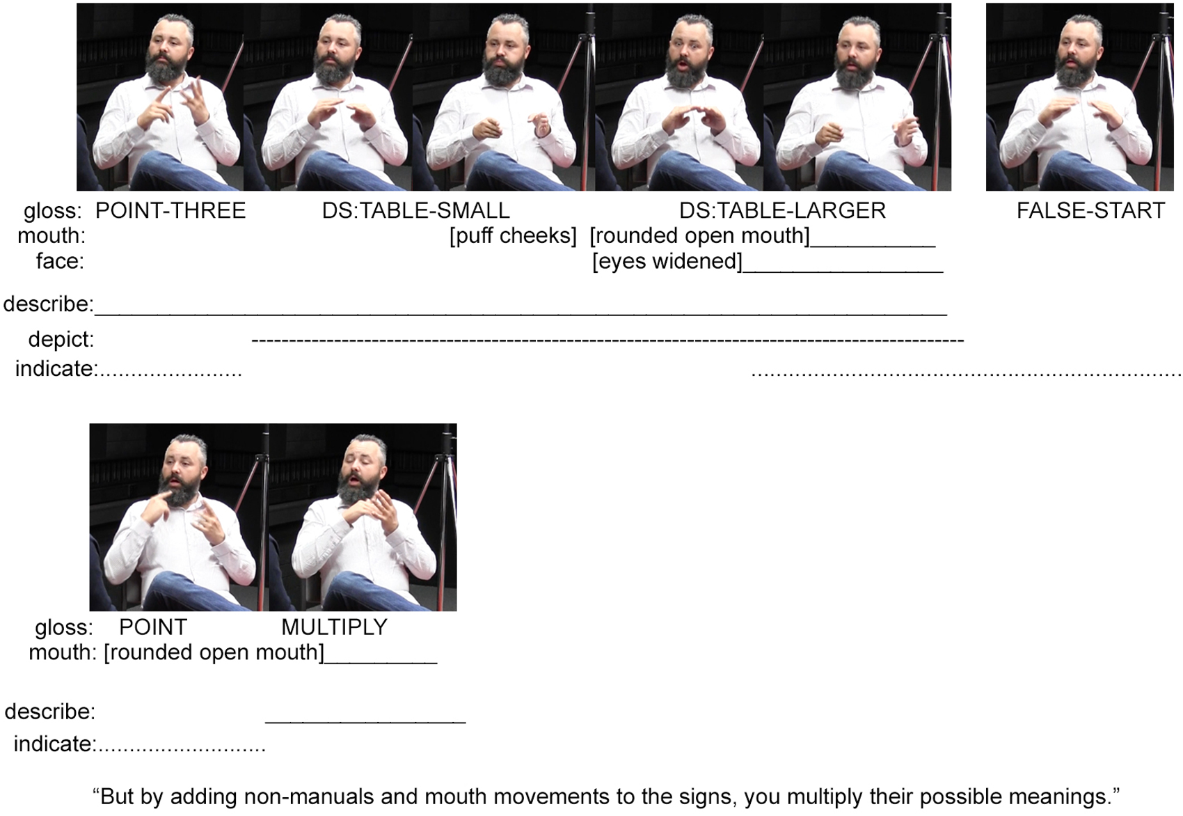Although these are just three versions of the lexical sign TABLE, the signer further explains that with different non-manual actions, one can multiply the meanings of these three signs. He does this by first describing his previous actions as ‘three signs’ via the fully conventional lexical signs (THREE SIGN THREE) and mouthings of the conventional English words ‘three’ and ‘sign’ (also illustrated in Figure 3). Using his right hand, he then points to the sign THREE, which was preserved on his left hand (Figure 4). This is possible because signers can hold signs over periods of time, creating possibilities of future interaction with those signs as physical entities. Although speakers are unable to hold spoken words over time while also continuing to speak, they can produce manual gestures that they interact with as physical entities.2 The signer’s point to the sign THREE indexes the three signs depicting the differently-sized tables produced earlier. He then repeats these depictions while adding various mouth movements and non-manual actions to this reproduction (see the top row in Figure 4). The signer concludes by explaining that these non-manual actions “multiply the meanings of signs” (thus justifying why deaf signed languages do not require extensive manual signed lexicons). This explanation is expressed through a pointing sign that indicates his mouth (and thereby indexes the various movements undertaken during the preceding depictions) and a description (the lexical sign MULTIPLY), which explains the multiplying effect such non-manuals have on the meanings of signs. Again, this example demonstrates how methods for description, indication, and depiction are integrated within composite utterances. By focusing on one method of signaling only, we are unable to account for the full expression of the utterance – too much would be left out.