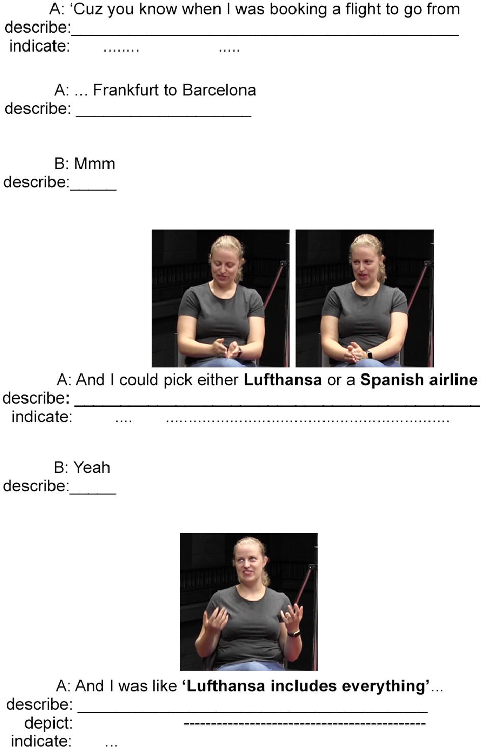 The example begins in Figure 5 with two utterances that introduce the topic through a description using spoken English lexis and syntax: “Cuz you know when I was booking a flight to go from …Frankfurt to Barcelona.” The speaker then makes eye-contact with her brother (who was engaged with picking up a glass and taking a sip of water while she spoke) as he provides a confirmatory “Mmm.” She continues with a composite utterance that describes with speech the possible choice of two airlines. As she names the two airlines, she produces hand movements to indicate the two choices and locate the choices in space. These pointing actions also work to set the two choices up in opposition: she points her hands joined at the fingertips to the left of her leg to indicate Lufthansa, and then to the right to indicate a Spanish airline. This multimodal, composite utterance effectively presents the topic of conversation—namely a comparison of two airlines—through acts of description and indication.