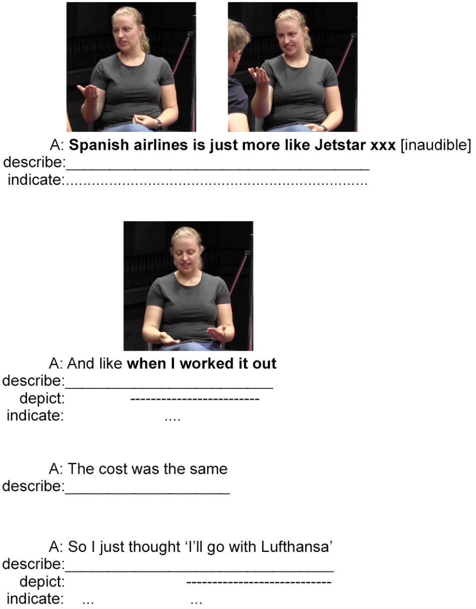 The next example involves composite utterances produced during an informal conversation between two hearing Australian English speakers. It was documented during the conversation task session for the Auslan and Australian English Corpus (Hodge et al., forthcoming). During this interaction, a hearing woman is chatting to her brother about a previous experience booking a flight for travel in Europe. She explains how she compared two airlines and discovered that the low-cost airline was not so low-cost after all. She does this by coordinating her speech, hand, and body in acts of description, indication, and depiction. This example is presented in Figures 5, 6 with relevant images of meaningful hand and body movements aligned with co-occurring periods of speech (represented in bold).