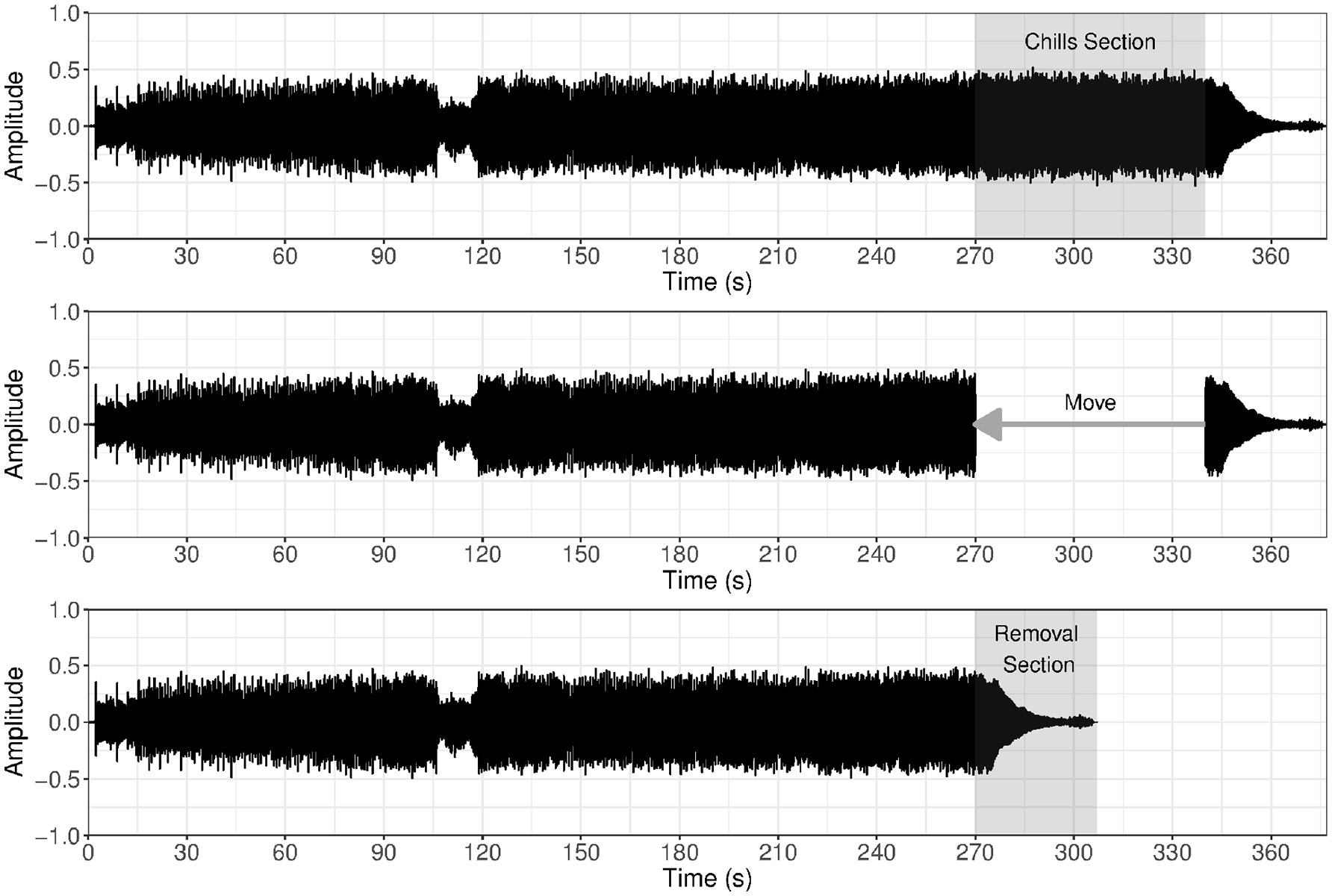 Example of audio editing procedure to create manipulated stimuli. First, the chills section is identified; second, the chills section is removed from the piece; thirdly, the music following the chills section is moved and spliced with the music that came before, resulting in what is termed the removal section. The figure depicts the piece Glósóli by Sigur Rós.