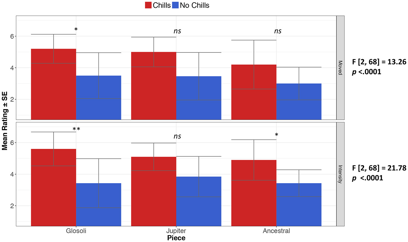 Mean ratings of being moved and emotional intensity for original conditions, depending on whether chills were experienced during listening (*p < 0.05, **p < 0.01); error bars indicate standard errors.
