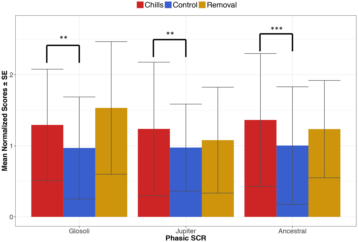 Average phasic SCR during chills, musical-control and removal sections within each piece (**p < 0.01, ***p < 0.001); error bars indicate standard errors.