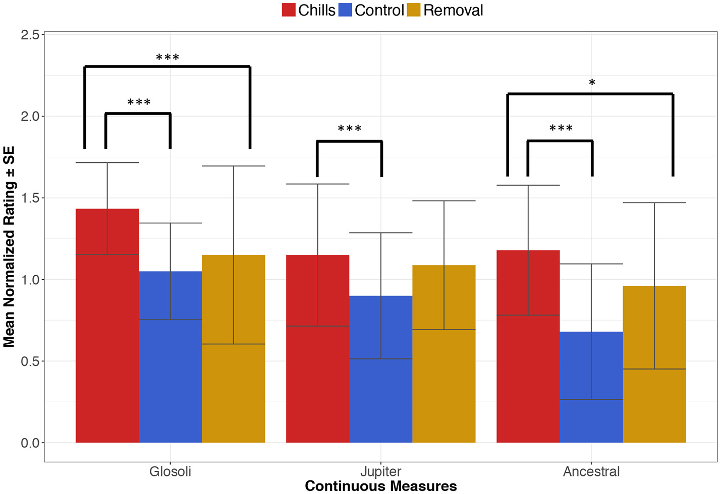 Mean continuous measurement ratings, comparing chills, control (musicological) and removal sections for each piece (*p < 0.05, ***p < 0.001); error bars indicate standard errors.