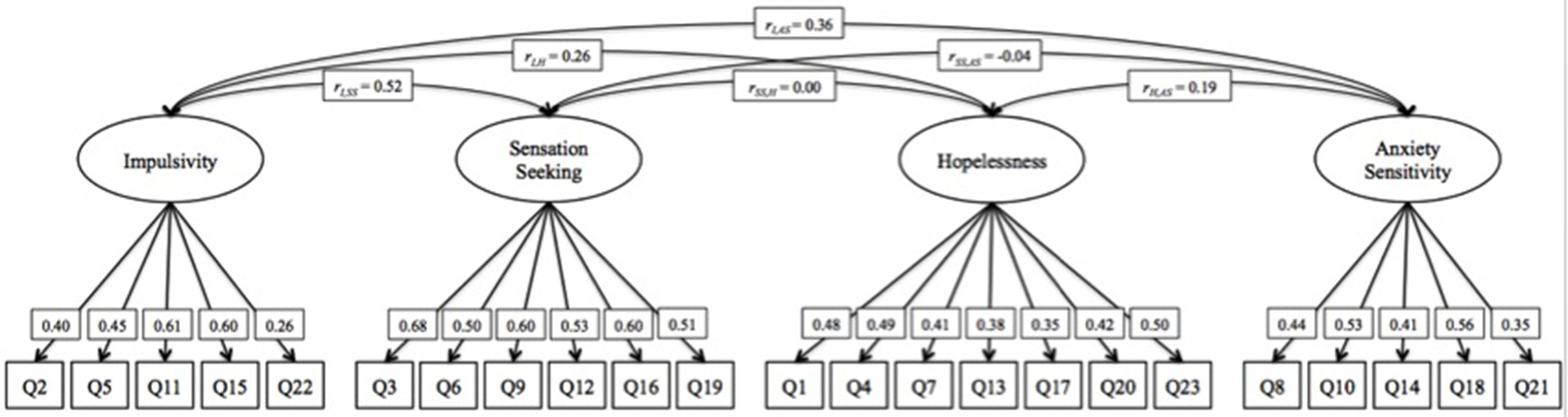 The Pearson correlation matrix between each SURPS subscale and other measures purported to assess the same construct are shown in Table 2. The SURPS-IMP correlated highly with the BIS-11 and UPPS-P (r = 0.69 and 0.71, respectively); the SURPS-SS correlated highly with the SSS-V and UPPS-P (r = 0.53 and 0.70, respectively); the SURPS-H correlated moderately with the BDI-II (r = 0.46); and the SURPS-AS correlated modestly to moderately with the ANXSI (r = 0.52), STAI-S (r = 0.23), and STAI-T (r = 0.36). Although the correlation between the SURPS-AS and the STAI-S (r = 0.23) was lower than other correlations, it is still significant and more highly correlated with the ANXSI. Taken together, these results demonstrate good convergent validity.