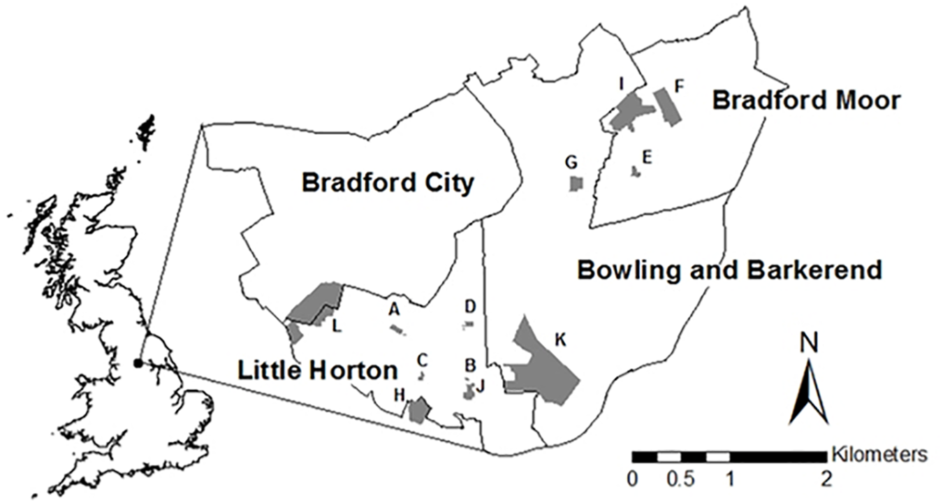 FIGURE 1. A map of the locations of the parks selected for study across the Better Start Bradford area, denoted by letters.