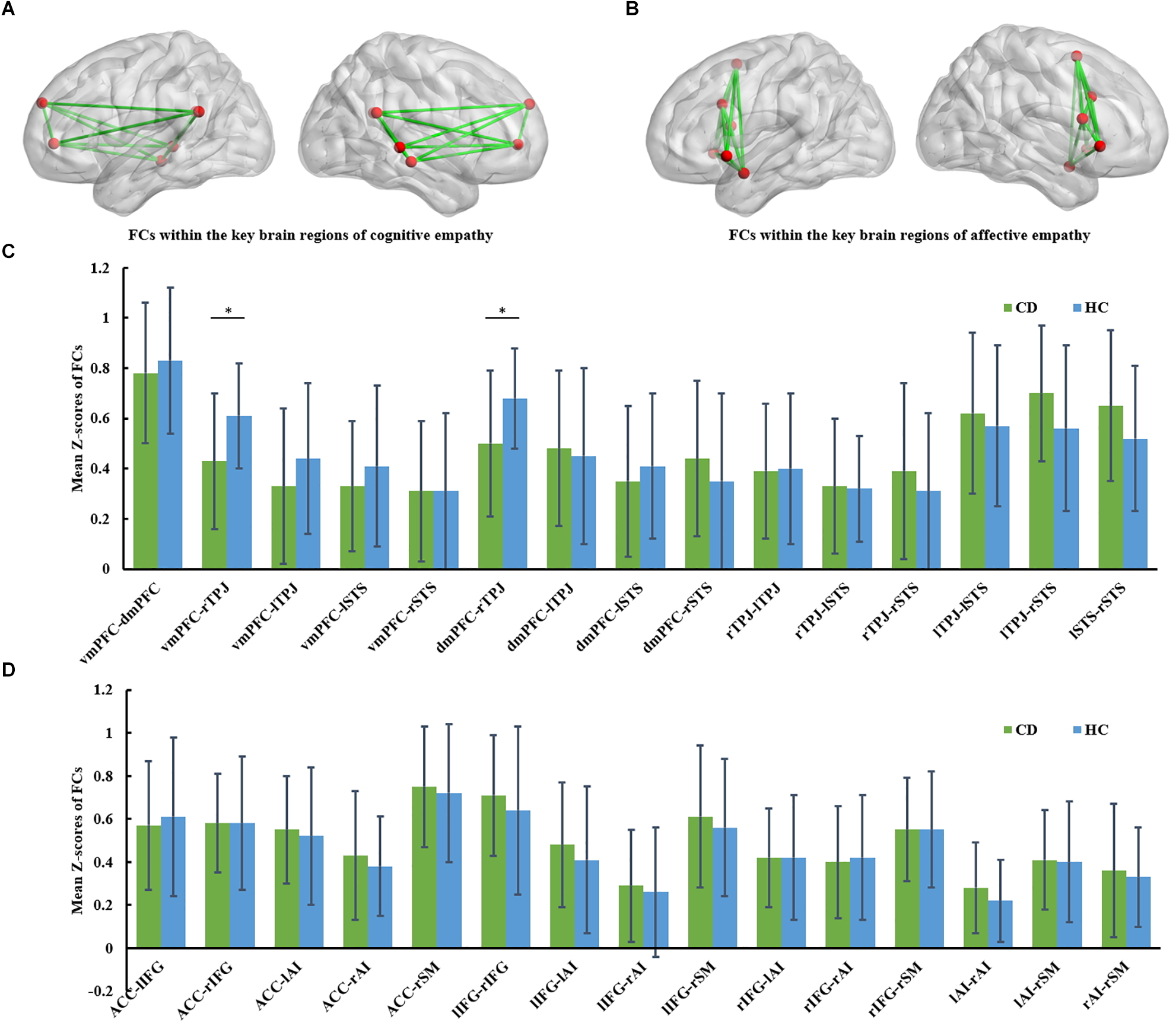 (A) FCs within the key brain regions of cognitive empathy. The cognitive empathy has 6 key brain regions including the ventromedial prefrontal cortex, dorsomedial prefrontal cortex, temporoparietal junction and superior temporal sulcus. The red spheres represent network nodes. The green edges represent inter-nodal functional connectivity (FC). (B) FCs within the key brain regions of affective empathy. The affective empathy has 6 key brain regions including the anterior cingulate, anterior insula, inferior frontal cortex and supplementary motor area. The red spheres represent network nodes. (C) Group differences between the conduct disorder (CD) group and healthy control (HC) group within the key brain regions of cognitive empathy. The CD group showed significantly reduced rTPJ-vmPFC and rTPJ-dmPFC FC relative to the HC group. ∗FDR corrected, p < 0.05. HC, healthy controls; CD, conduct disorder; vmPFC, ventromedial prefrontal cortex, dmPFC; dorsomedial prefrontal cortex; TPJ, temporoparietal junction; STS, superior temporal sulcus. (D) Group differences between the conduct disorder (CD) group and healthy control (HC) group within the key brain regions of affective empathy. No significant differences were observed between the CD group and HC group in the affective empathy network. ACC, anterior cingulate cortex; AI, anterior insula; IFG, inferior frontal cortex; SM, supplementary motor cortex.