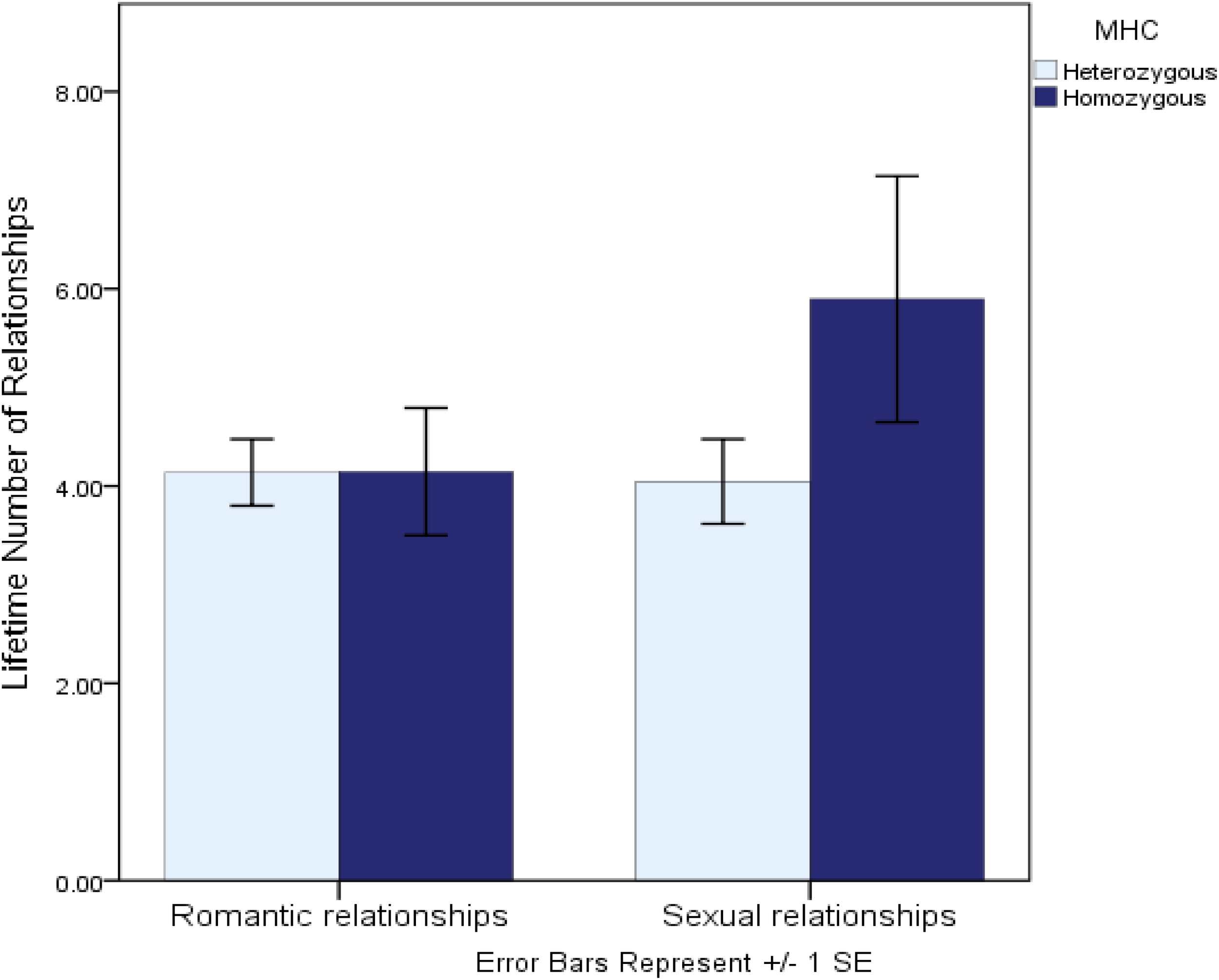 Another recent study investigated genetic variation at the MHC region of the genome—a region in which greater allelic diversity is associated with a greater ability to recognize invading non-self (vs. self) antigens. This study, conceptually underpinned by life history theory, examined whether lower heterozygosity (diversity) at the MHC—a putative marker of lower immunocompetence and thus a marker of greater future uncertainty—was associated with “faster” sexual strategies in women (Murray et al., 2017). Consistent with the predictions implied by life history theory, women who were more homozygous at the MHC region of the genome reported more favorable attitudes toward short-term mating, a more promiscuous sexual history, and perhaps most tellingly, reported being almost a full year younger when they had their sexual debut. Further comparative tests revealed that while more homozygous women reported significantly more sexual relationships, they reported an identical number of romantic relationships as did heterozygous women (see Figure 1). This comparative test suggests that the interpersonal implications of MHC diversity are specific to sexual strategies, rather than interpersonal dispositions more generally. Taken together, these studies suggest that genetic variants linked to chronically increased immunological vulnerabilities may also be associated with behavioral dispositions that help to either mitigate those vulnerabilities or to calibrate life history strategies accordingly.