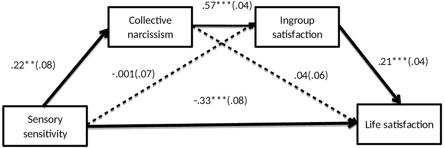 The present results also suggest that sensory processing sensitivity may be positively, although indirectly, associated with life satisfaction. Serial multiple mediation analysis was performed to test this prediction entering sensory processing sensitivity as a predictor, life satisfaction as the outcome and collective narcissism and in-group satisfaction as serial mediators (using PROCESS macro for SPSS, Model 6, Hayes, 2013). The analysis produced a significant, negative, direct effect of sensory processing sensitivity on life satisfaction. It also produced a positive, indirect effect via collective narcissism and in-group satisfaction, IE = 0.03, SE = 0.01; 95%CI [-0.006; -0.06]. The indirect effect via collective narcissism, IE = 0.009, SE = 0.01; 95%CI [-0.01; 0.04] or via in-group satisfaction, IE = -0.001, SE = 0.02; 95%CI [-0.03; 0.03] were not significant (Figure 1). This suggests that, because of the positive overlap between collective narcissism and in-group satisfaction, a sensitive person can access the psychological resources offered by positive social identification to improve individual wellbeing.