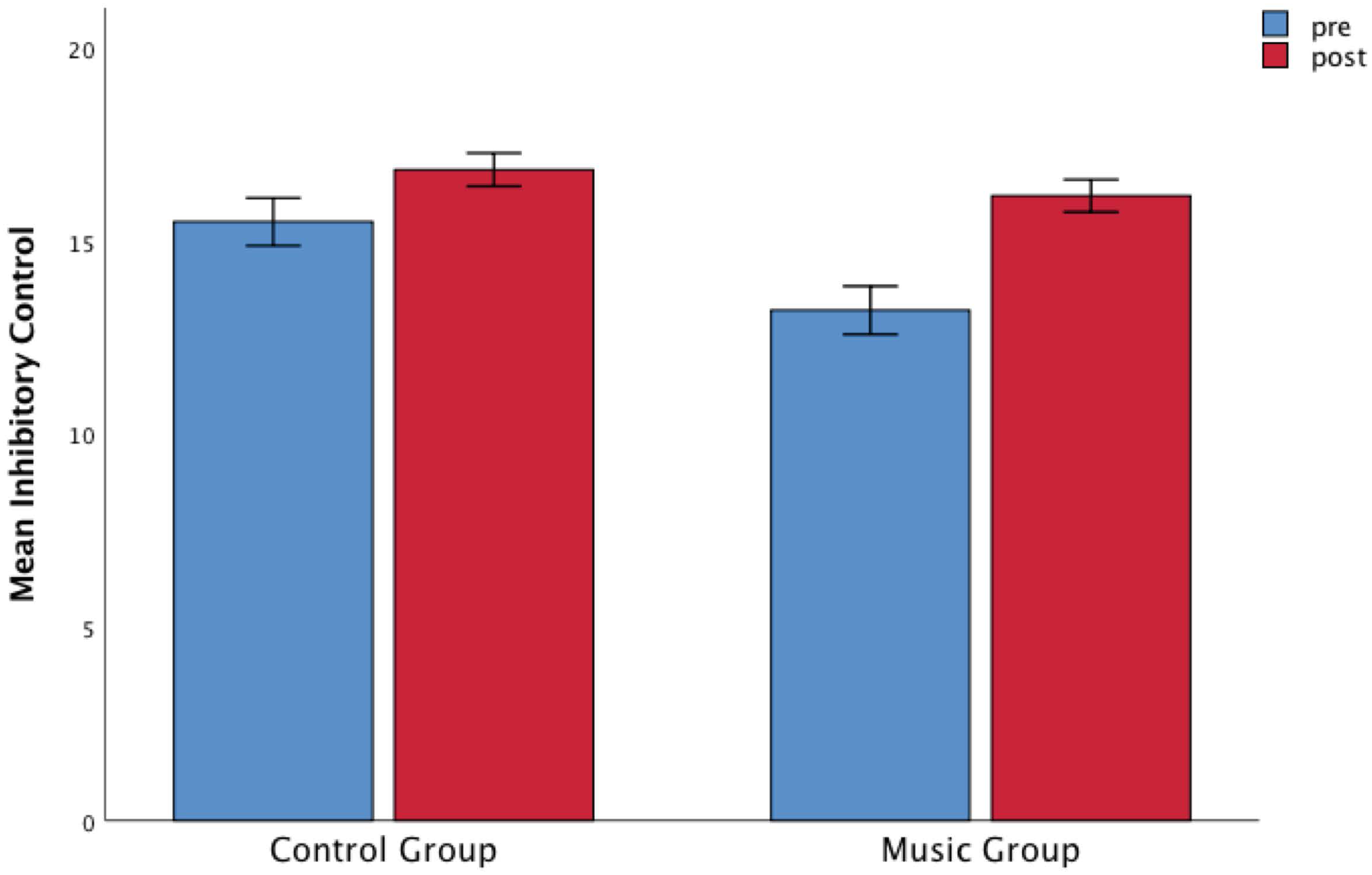 Figure 2. The music group was associated with an increase in inhibitory control scores starting from a significantly lower score at pre-test compared to the control group. Children’s mean scores as a function of Time (pre-test and post-test) and Group (music and control). Error bars are standard errors.